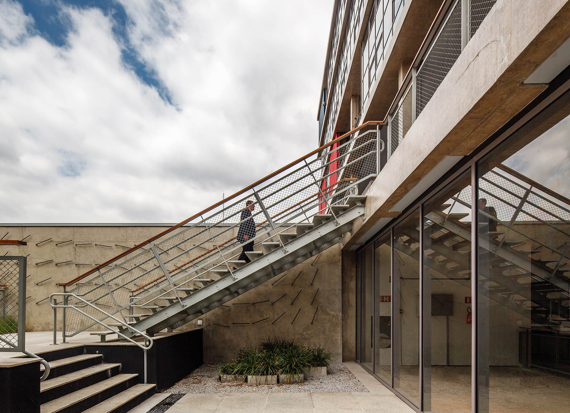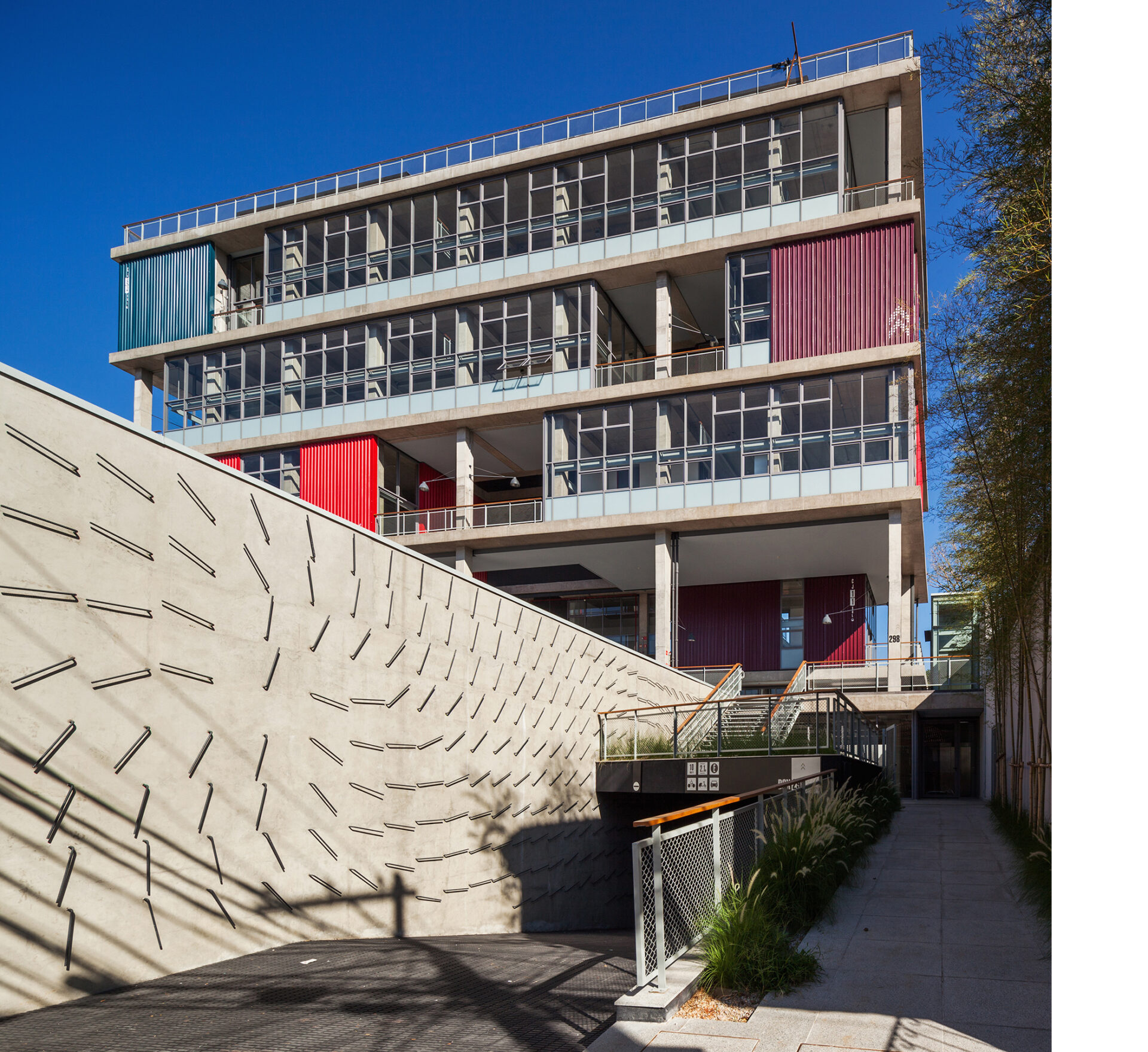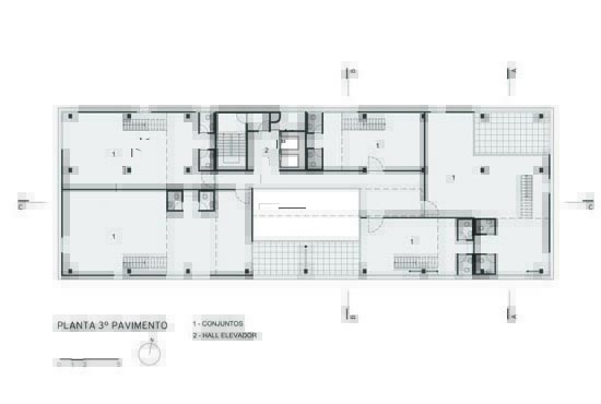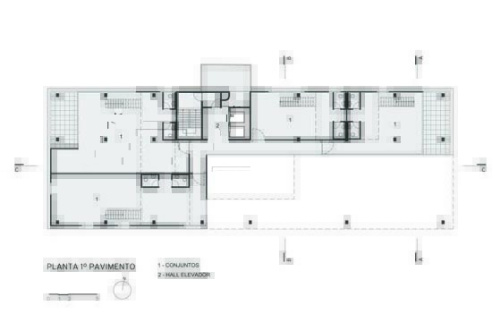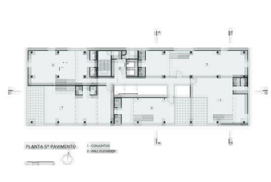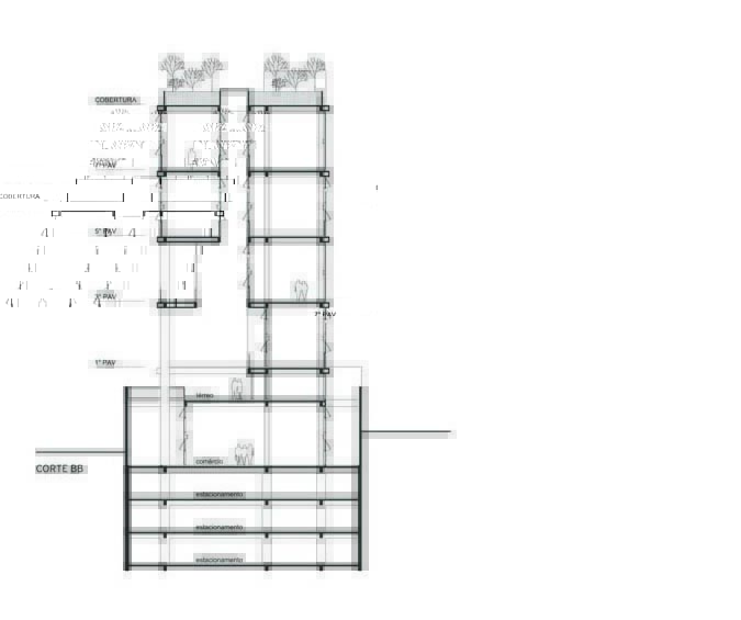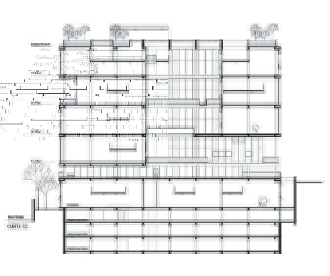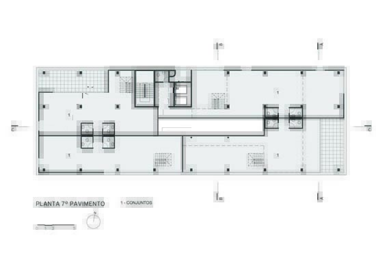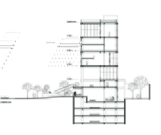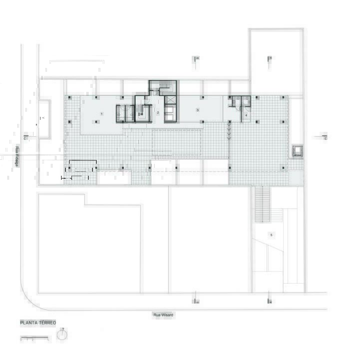 A implantação do edifício no lote explora a possibilidade de conexão entre as ruas Wisard e Fidalga. Esta conexão valoriza a percepção espacial e visual do lugar. Desta forma cria-se um percurso contínuo que se inicia no passeio público e conduz a um generoso hall aberto que conta com pé direito triplo e com as visuais livres. A construção da lamina superior expressa o conceito de um edifício flexível, através da sobreposição de lajes com pé direito duplo e fechamentos leves posicionados demaneira alternada, proporcionando espaços diversificados e também grande liberdade para a ocupação de seus espaços internos.