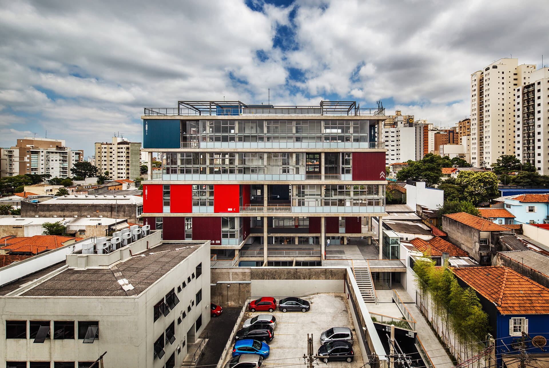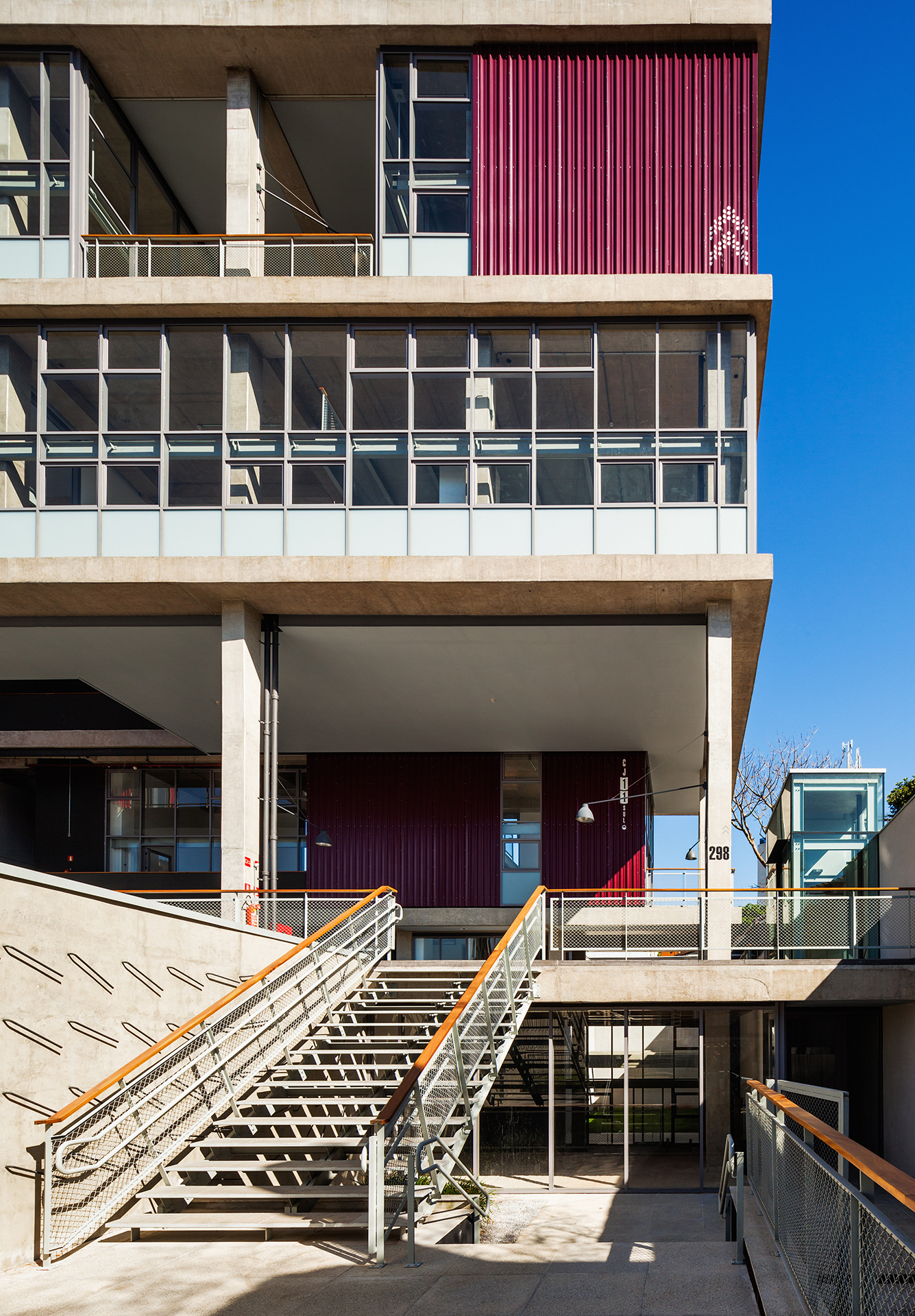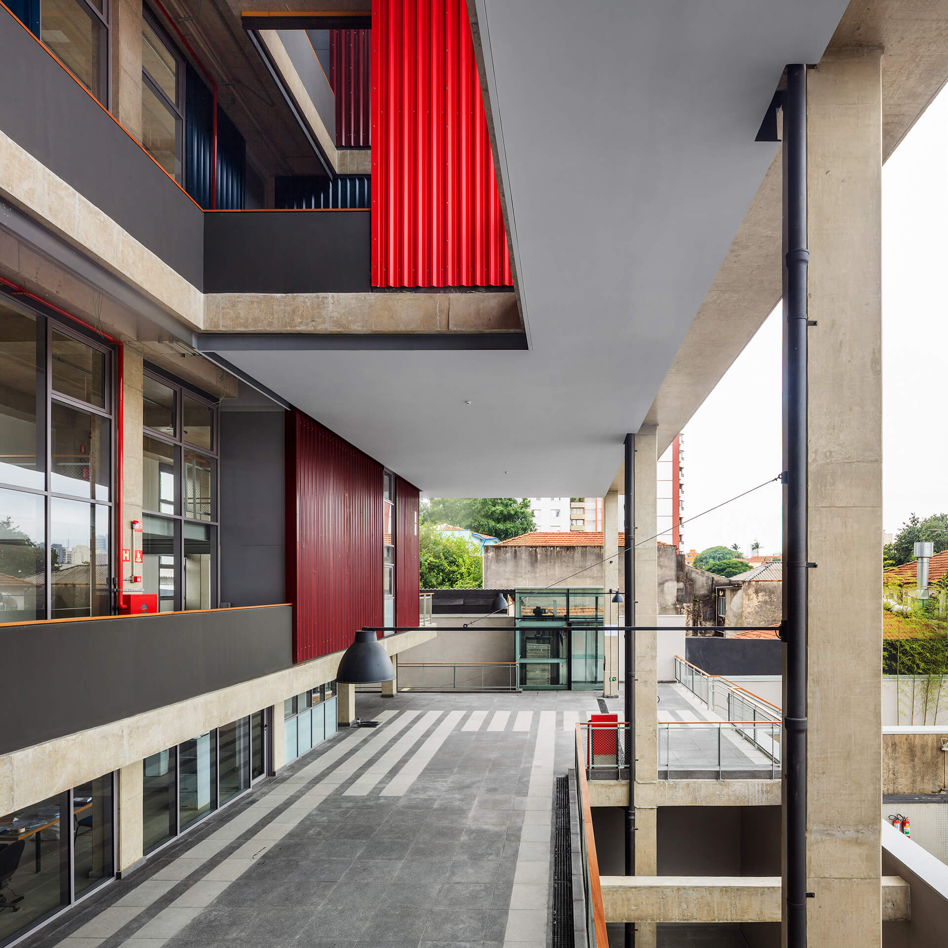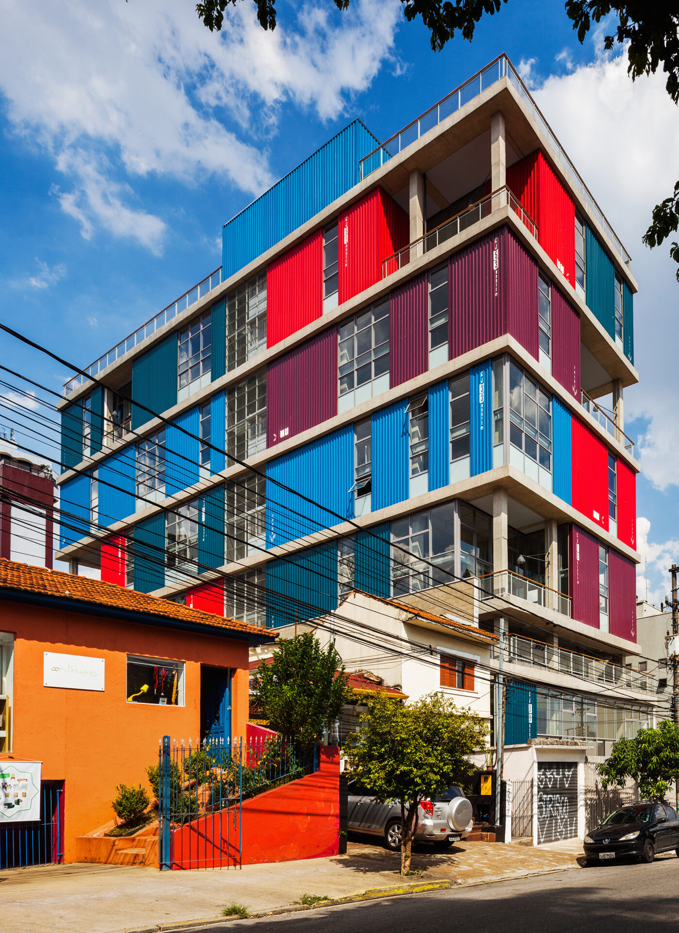A implantação do edifício no lote explora a possibilidade de conexão entre as ruas Wisard e Fidalga. Esta conexão valoriza a percepção espacial e visual do lugar. Desta forma cria-se um percurso contínuo que se inicia no passeio público e conduz a um generoso hall aberto que conta com pé direito triplo e com as visuais livres. A construção da lamina superior expressa o conceito de um edifício flexível, através da sobreposição de lajes com pé direito duplo e fechamentos leves posicionados demaneira alternada, proporcionando espaços diversificados e também grande liberdade para a ocupação de seus espaços internos.