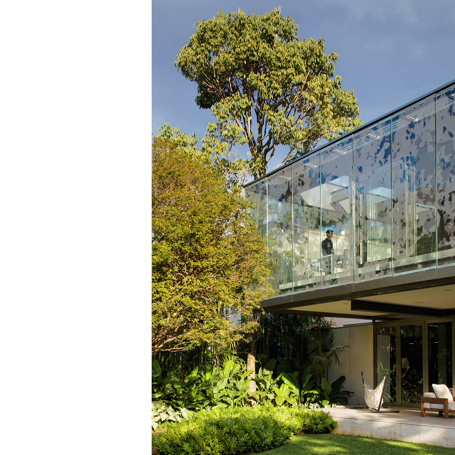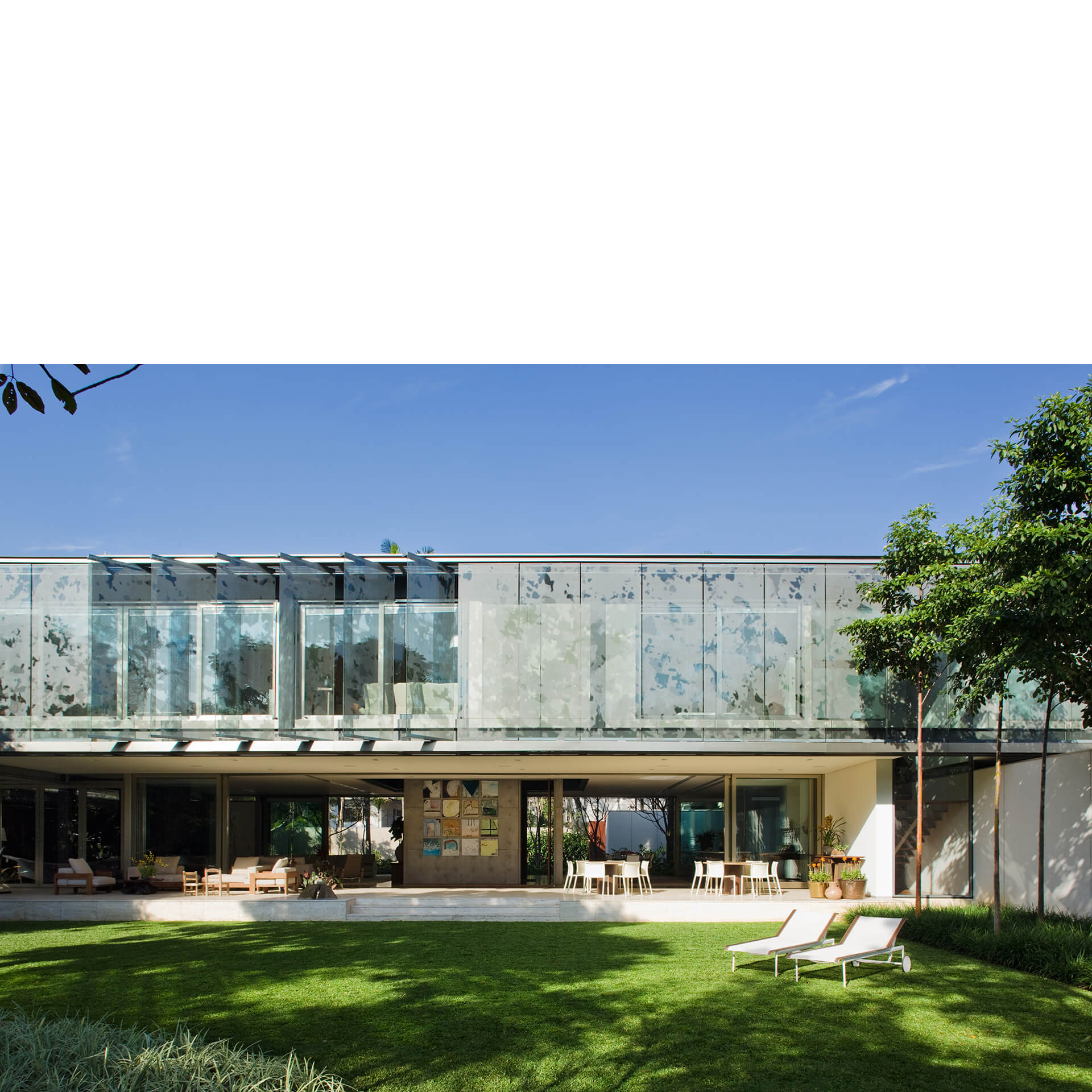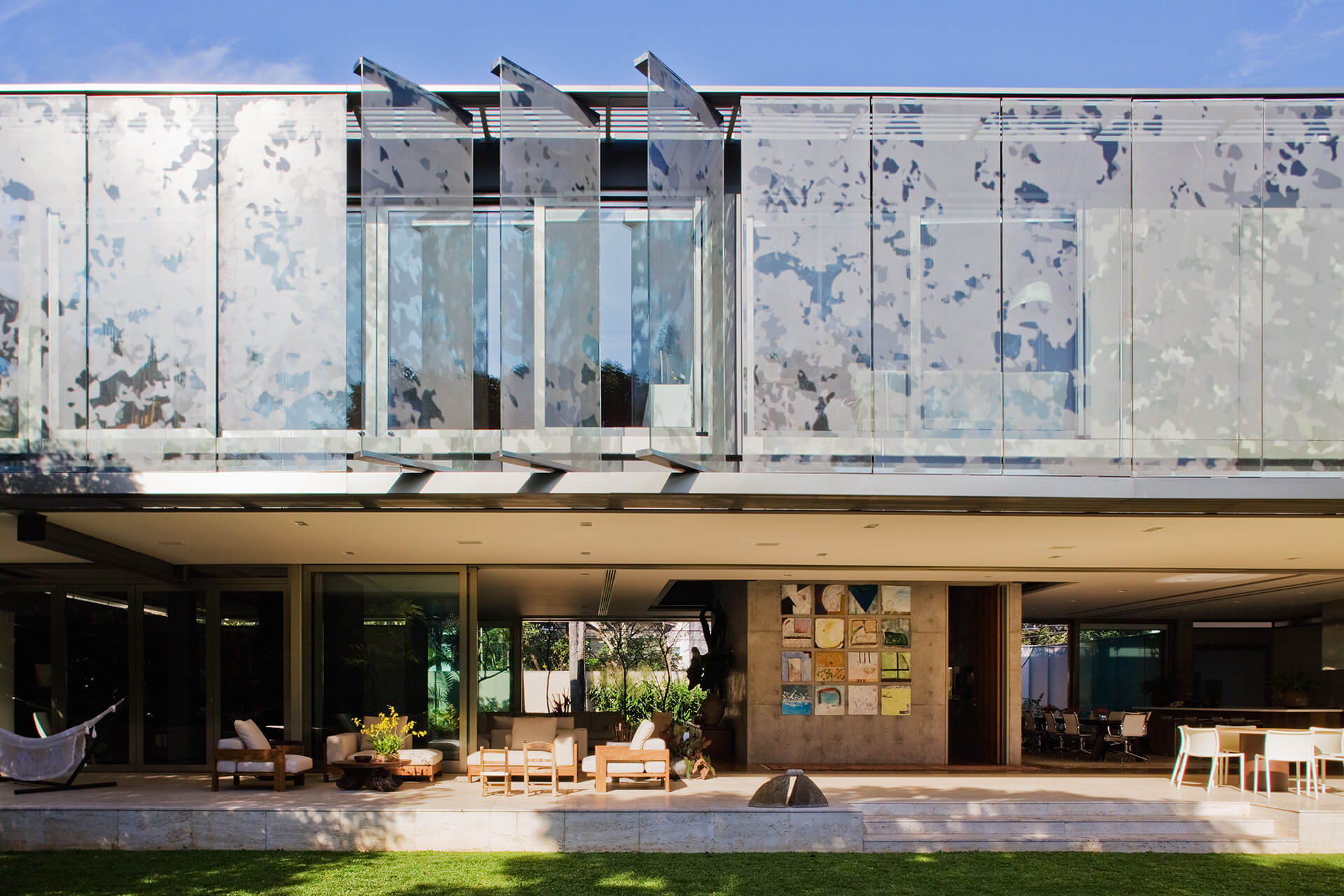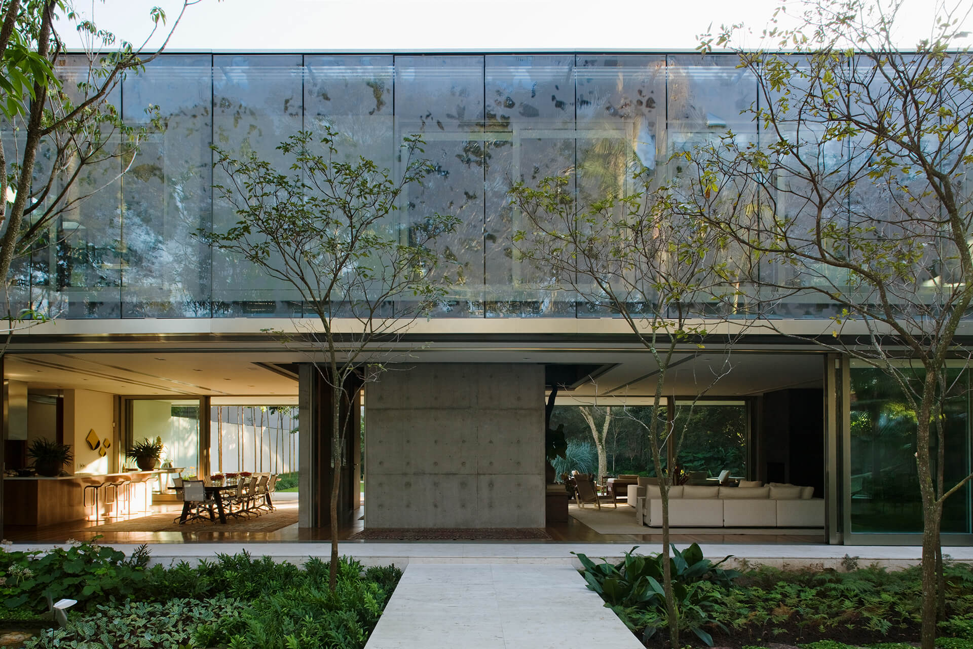Todo o volume superior é fechado por uma pele de vidro serigrafado, que funciona como filtro de luz e quebra-sol. A estampa que compõe a serigrafia funciona como uma reverberação da imagem do parque na superfície da casa, reforçando a interdependência entre o objeto arquitetônico e a natureza.