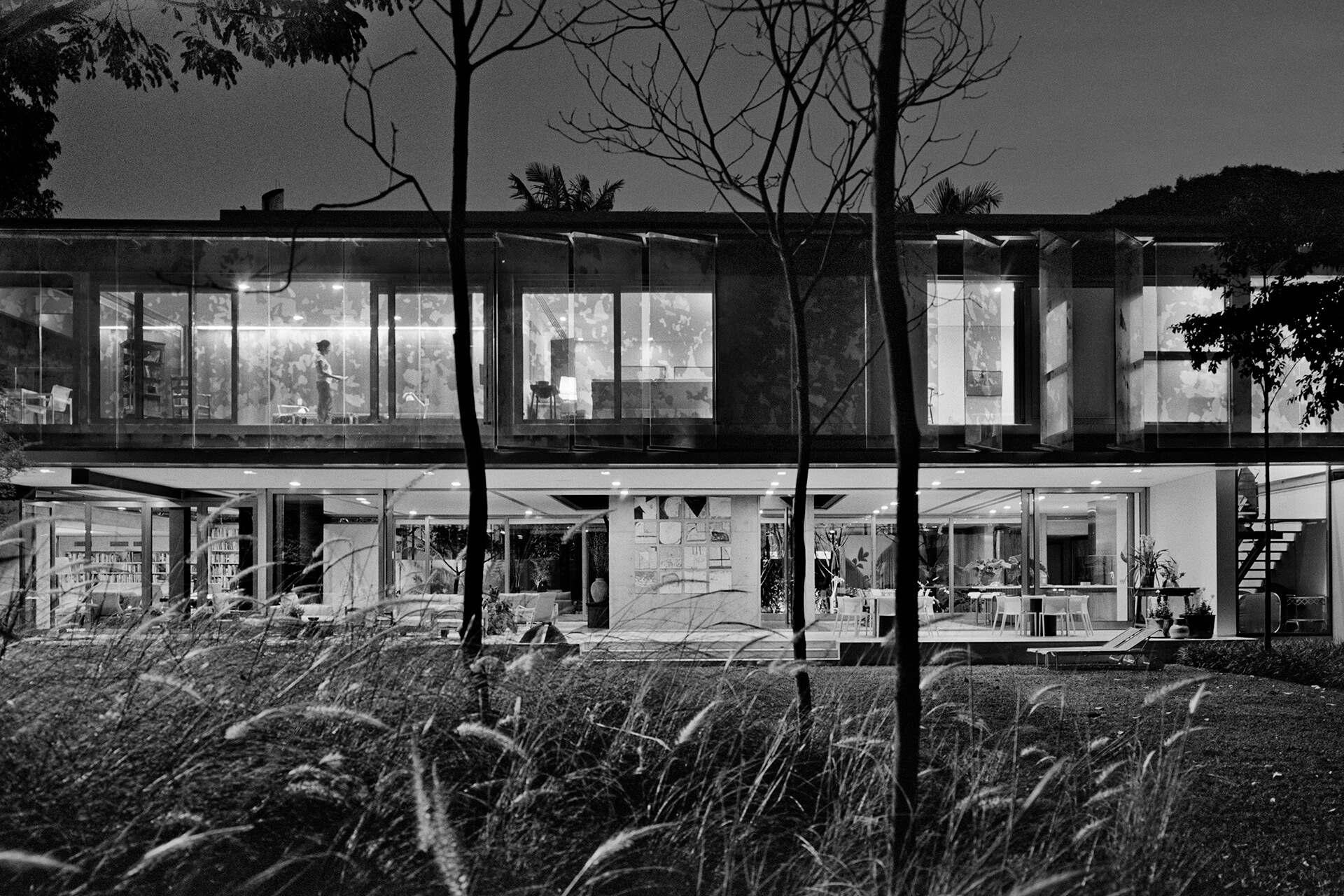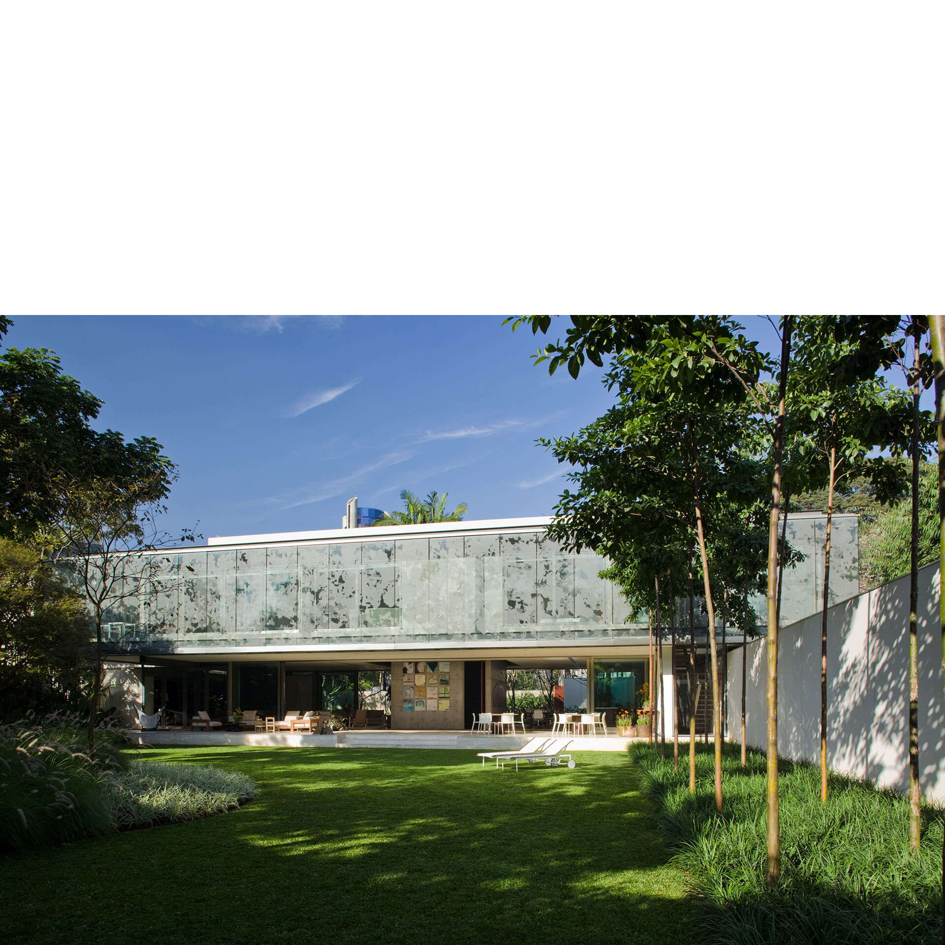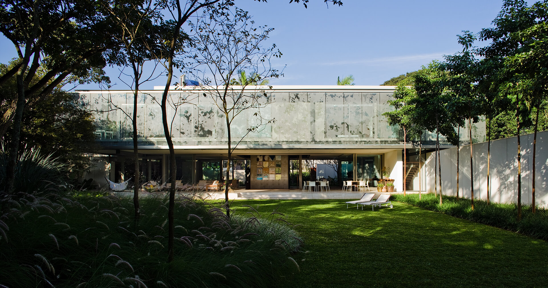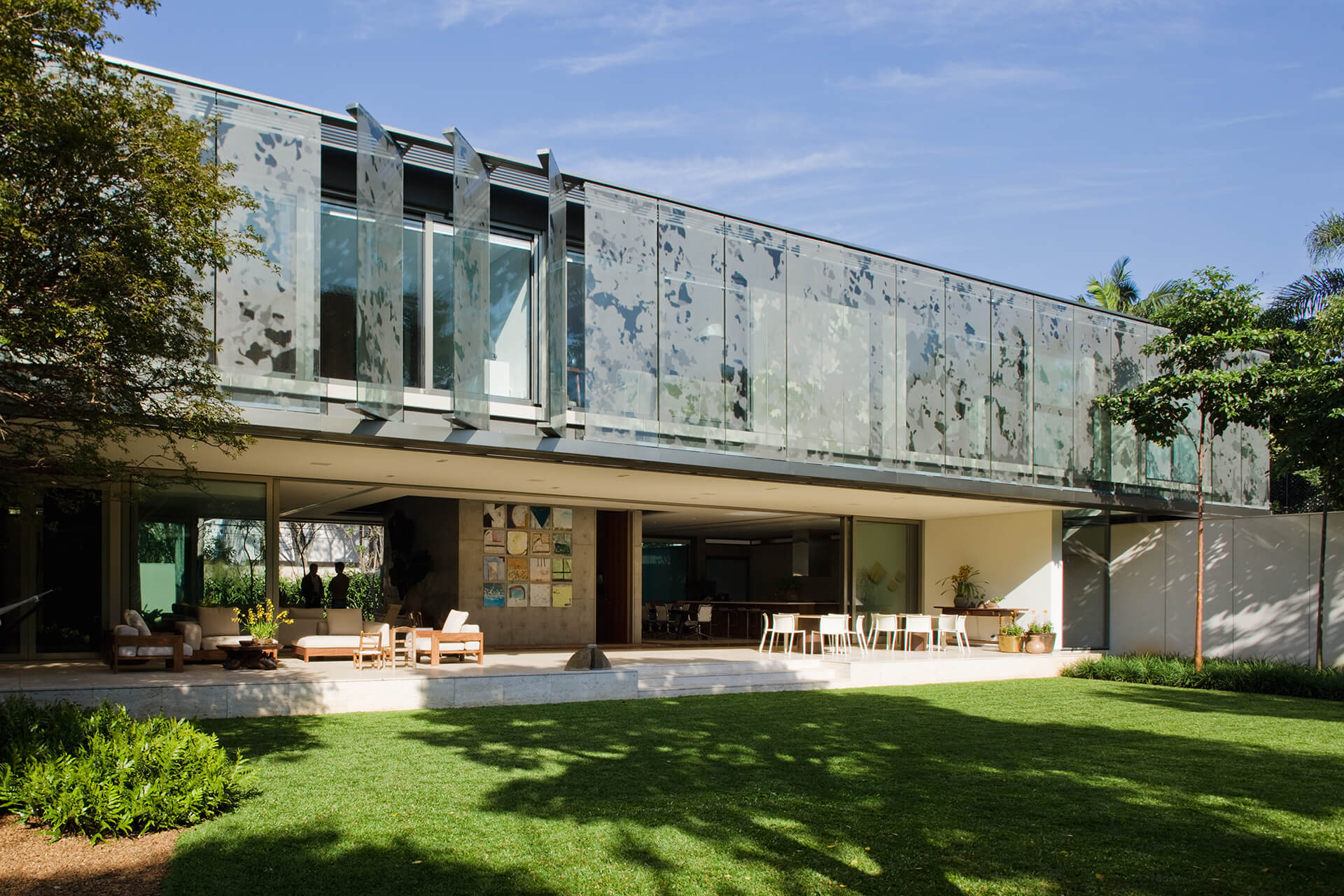 Todo o volume superior é fechado por uma pele de vidro serigrafado, que funciona como filtro de luz e quebra-sol. A estampa que compõe a serigrafia funciona como uma reverberação da imagem do parque na superfície da casa, reforçando a interdependência entre o objeto arquitetônico e a natureza.