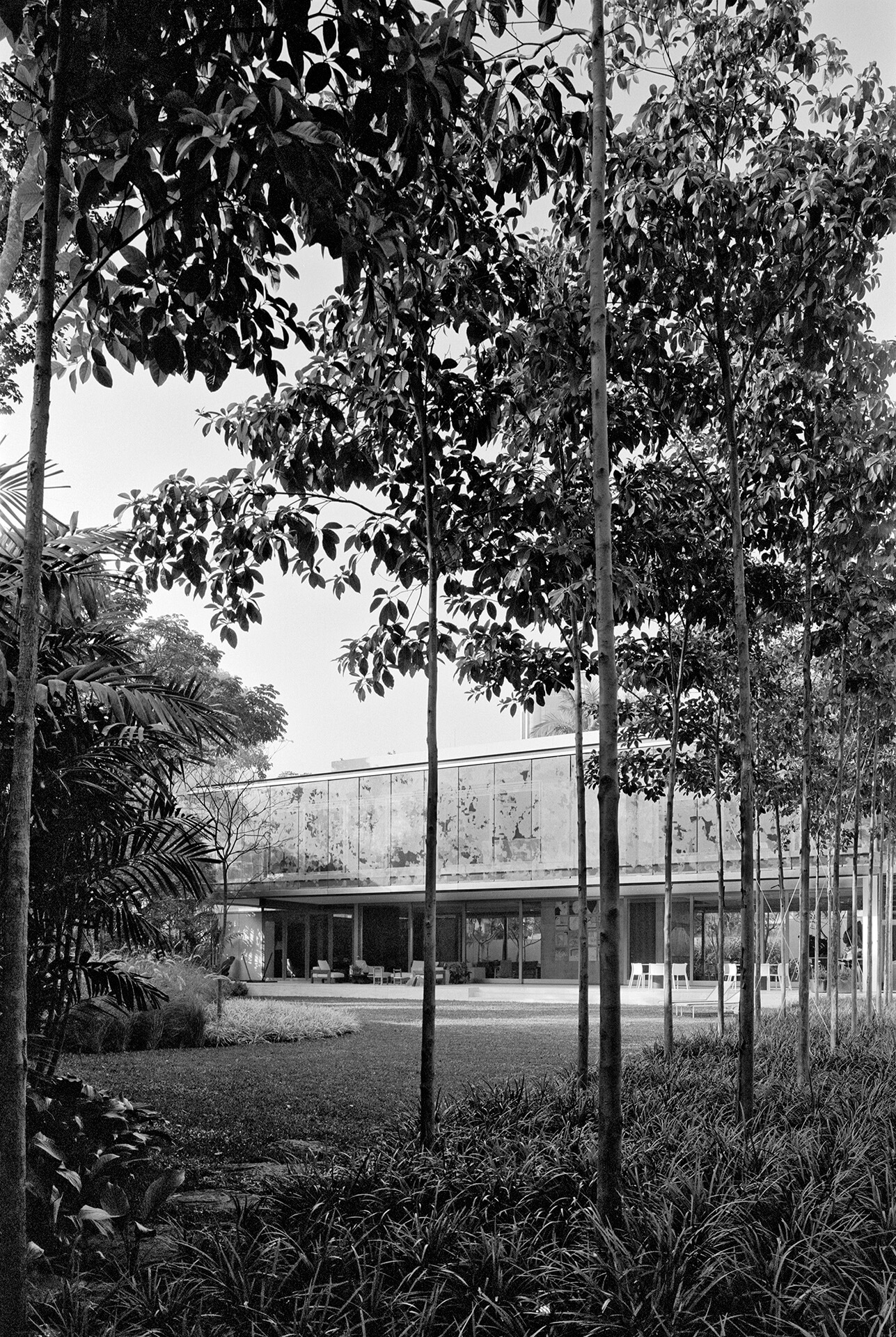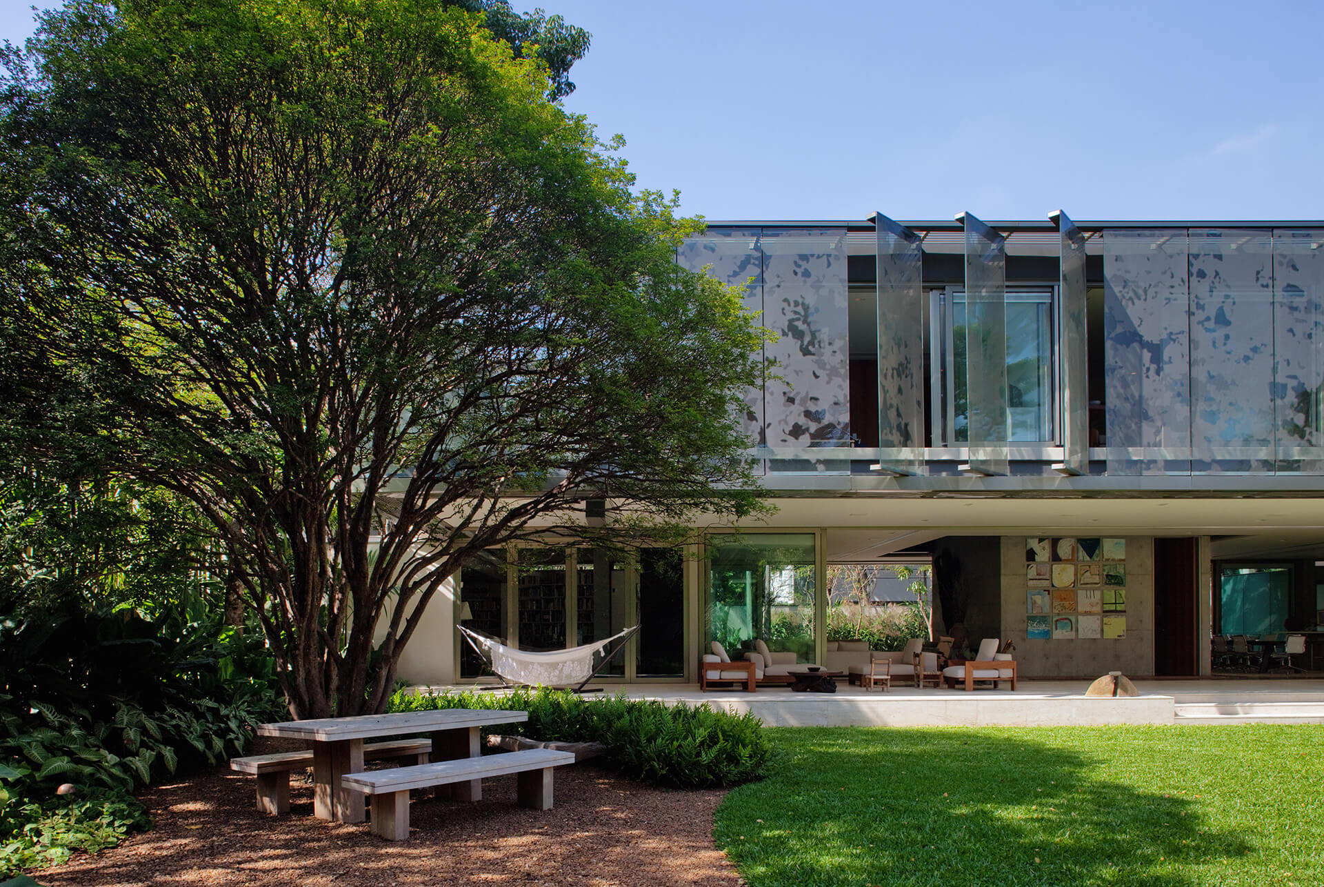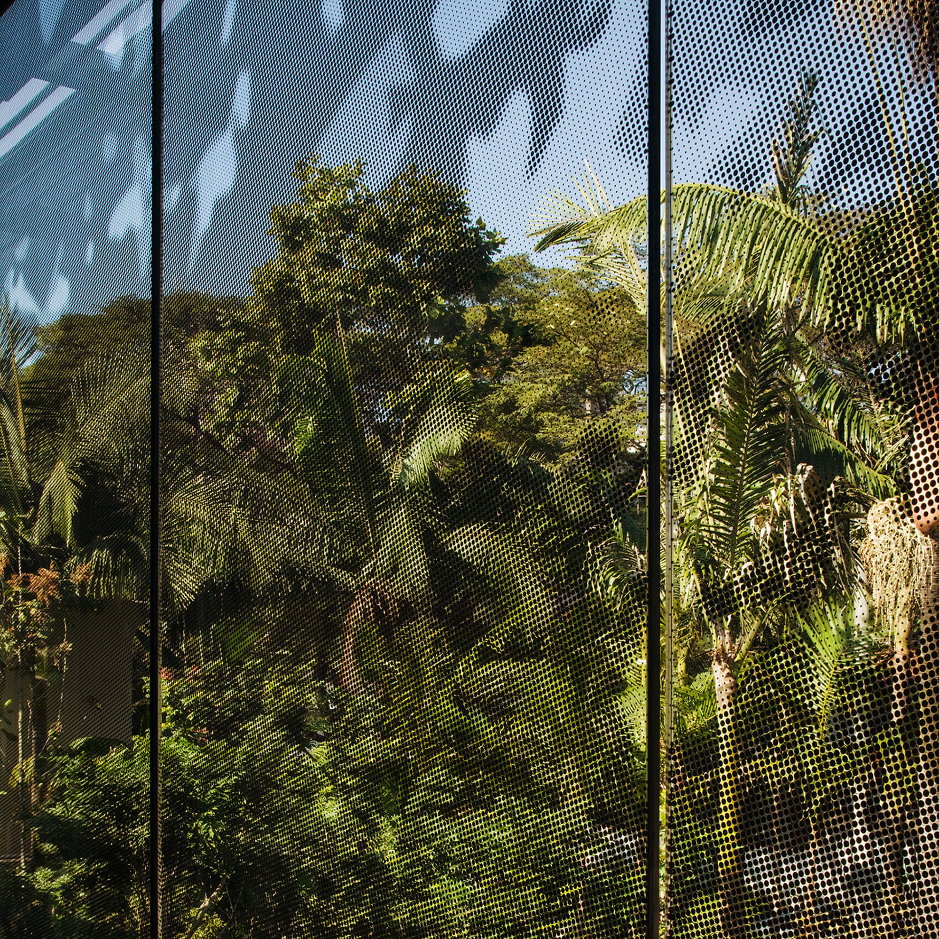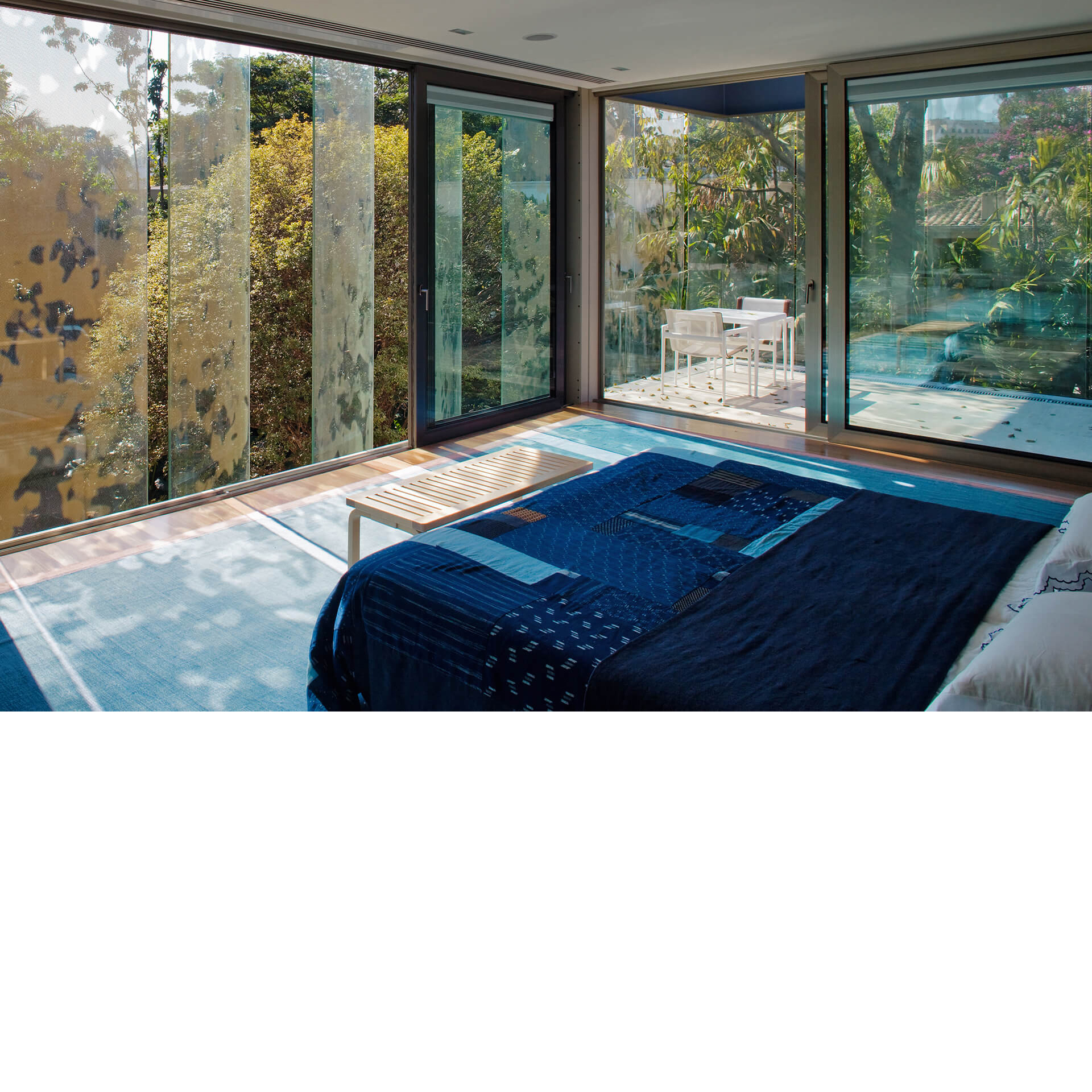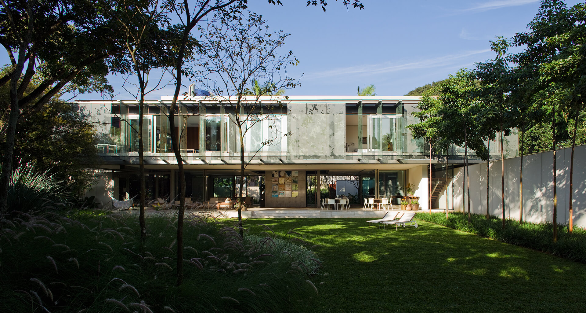 Todo o volume superior é fechado por uma pele de vidro serigrafado, que funciona como filtro de luz e quebra-sol. A estampa que compõe a serigrafia funciona como uma reverberação da imagem do parque na superfície da casa, reforçando a interdependência entre o objeto arquitetônico e a natureza.