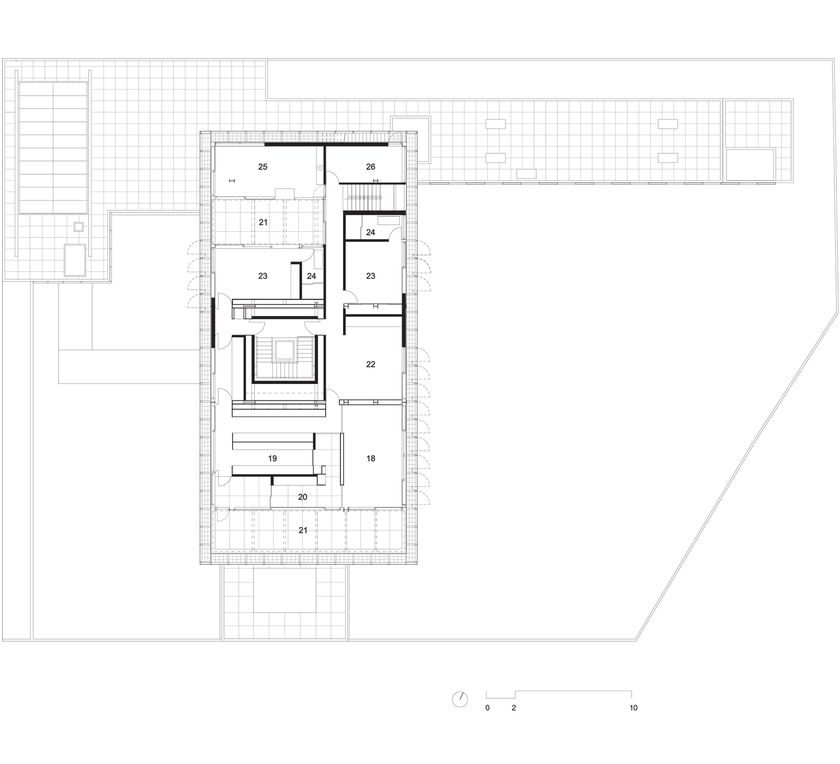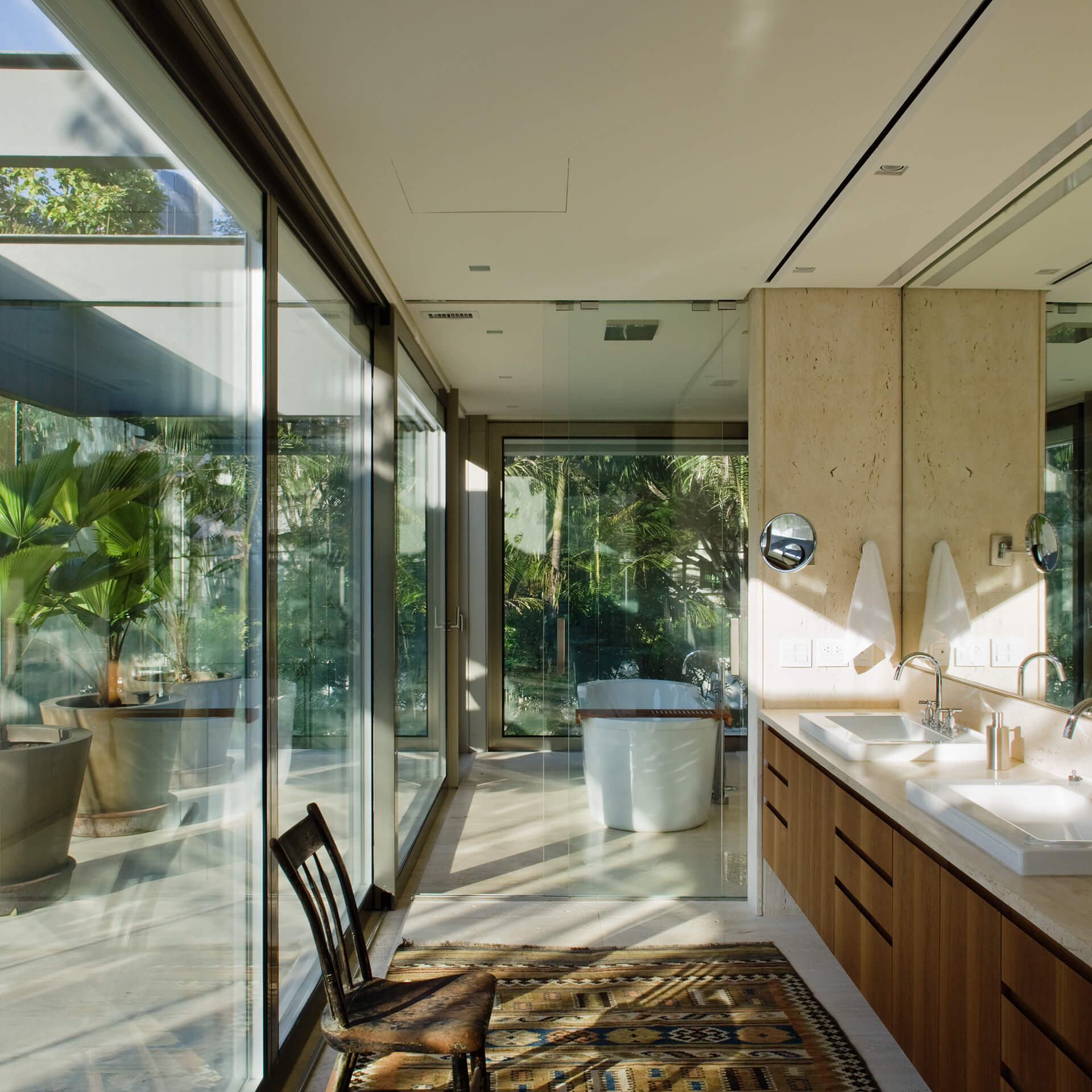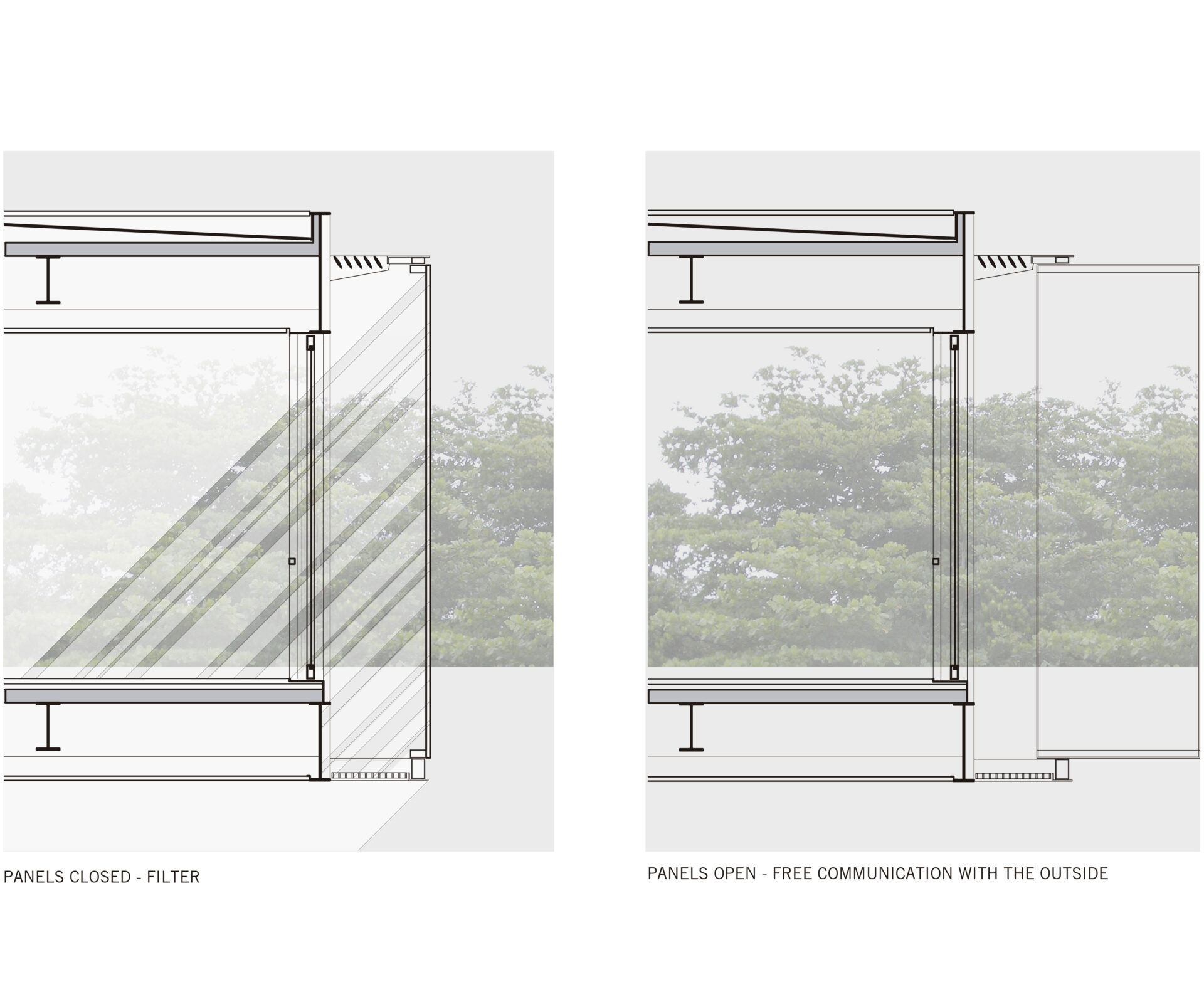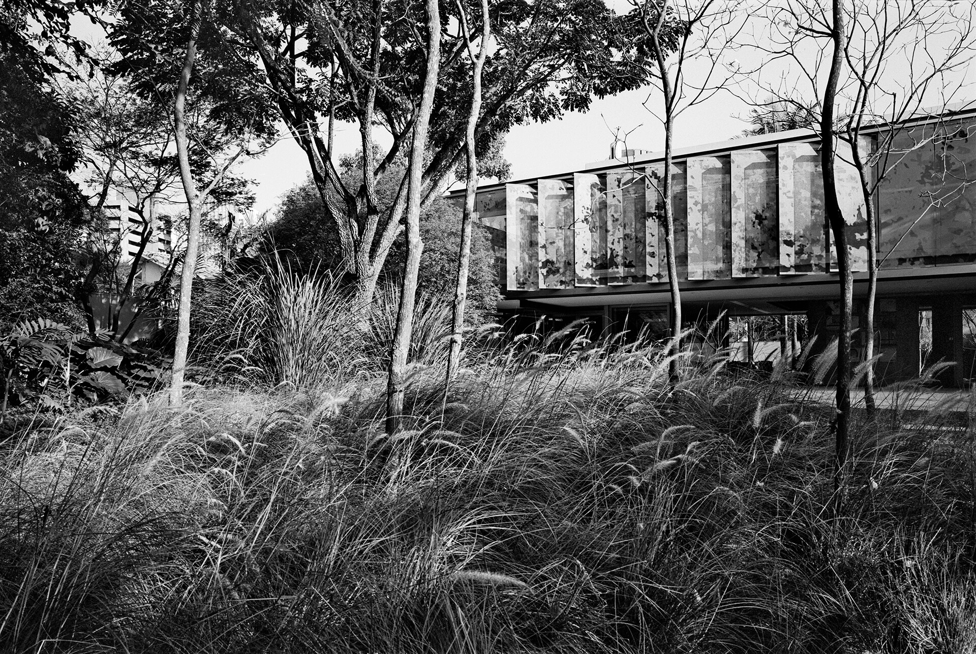 Todo o volume superior é fechado por uma pele de vidro serigrafado, que funciona como filtro de luz e quebra-sol. A estampa que compõe a serigrafia funciona como uma reverberação da imagem do parque na superfície da casa, reforçando a interdependência entre o objeto arquitetônico e a natureza.