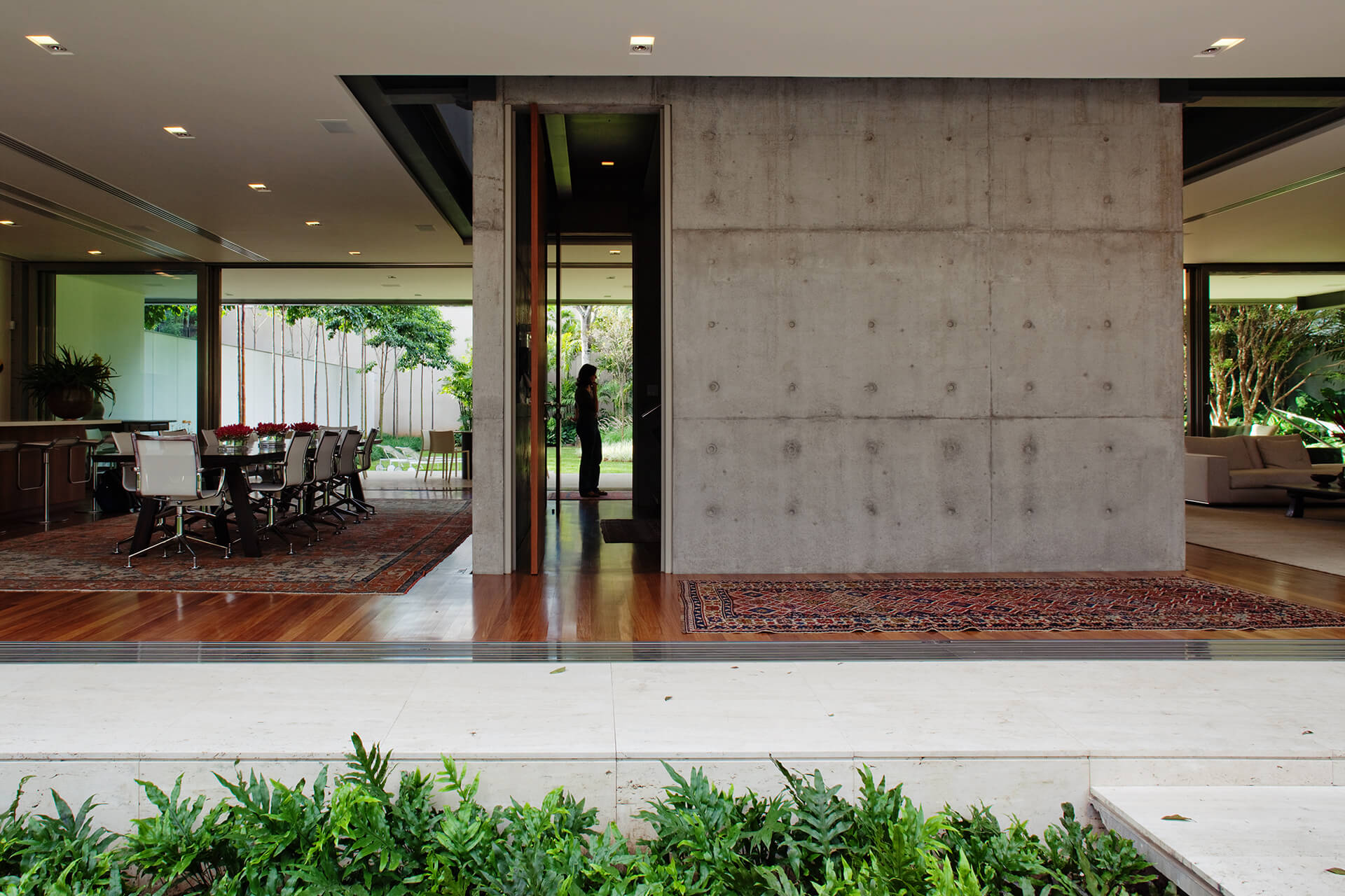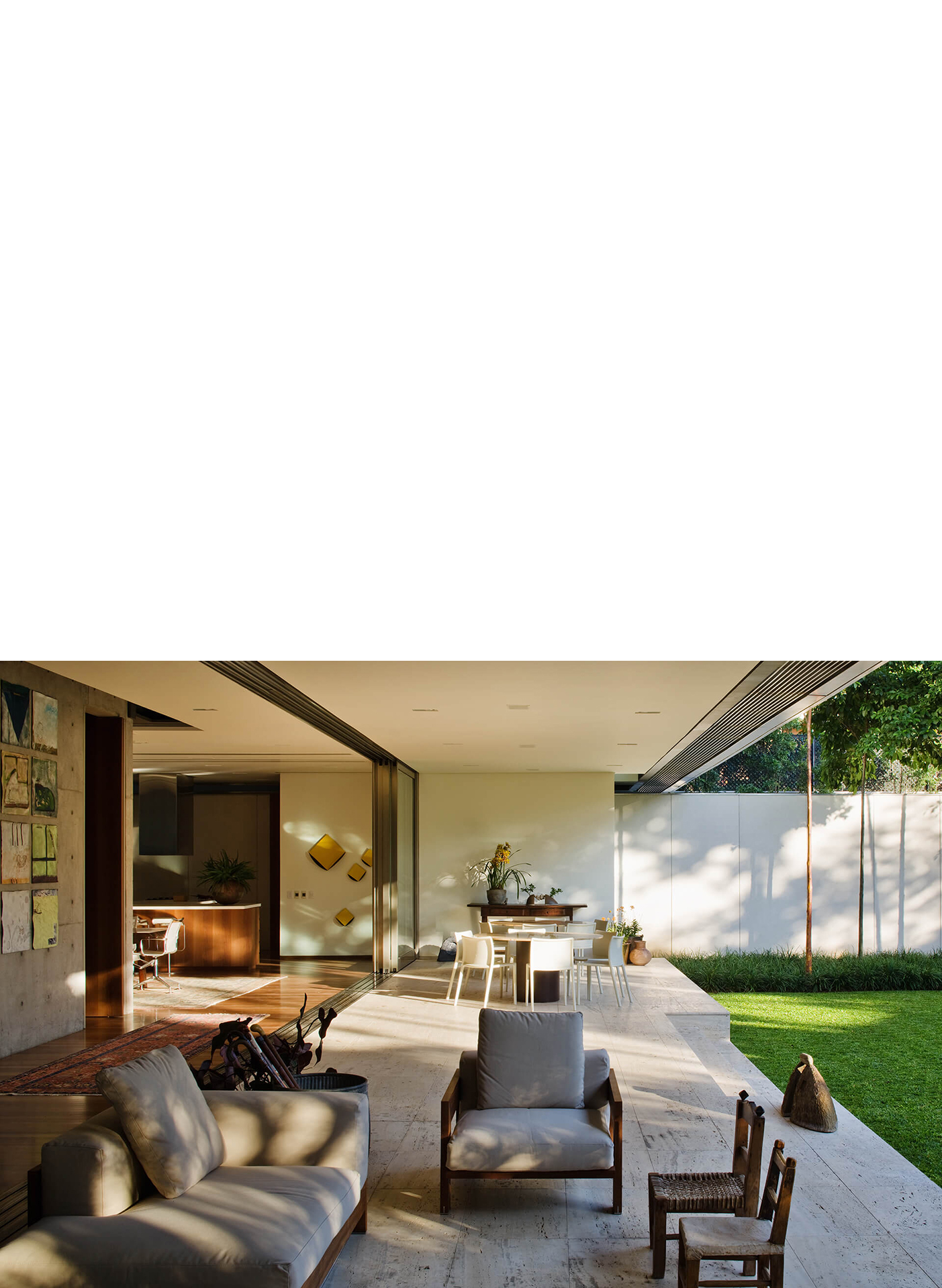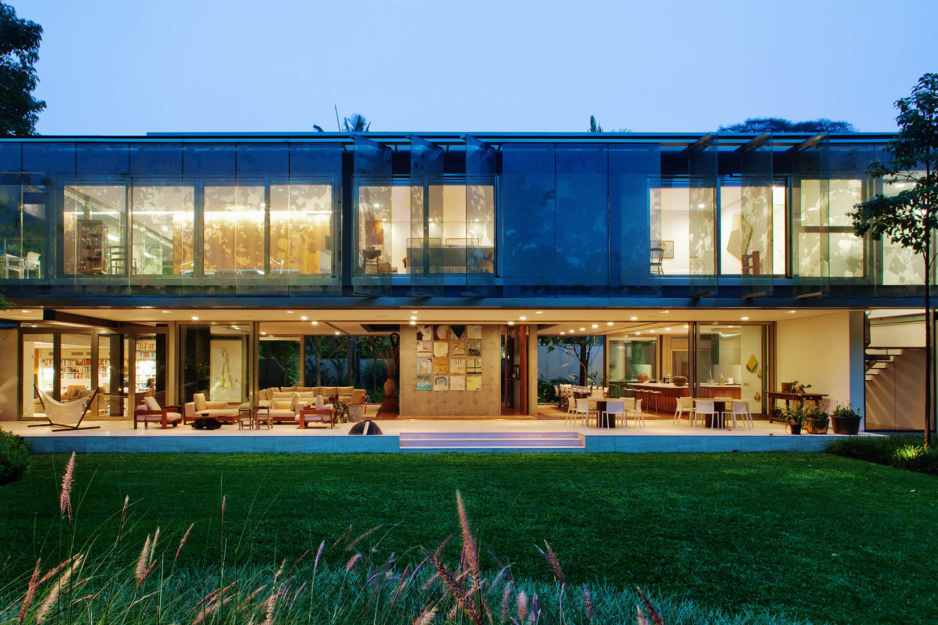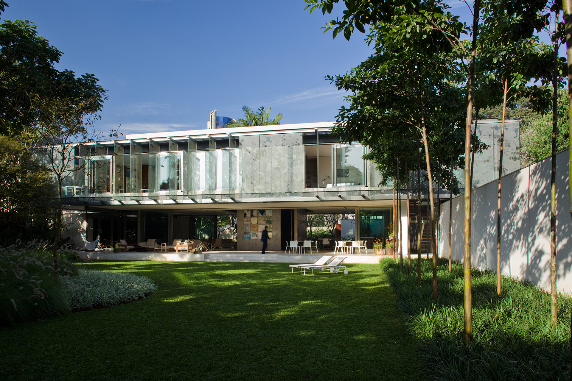 No térreo, os espaços de convívio estão localizados sob a sombra do volume superior da casa, conectados aos jardins através de uma grande varanda e das portas decorrer de vidro — que podem ser recolhidas totalmente, criando uma abertura de 14m de largura. O volume superior, concebido como uma caixa translúcida, abriga os quartos e outros ambientes que requerem maior privacidade.