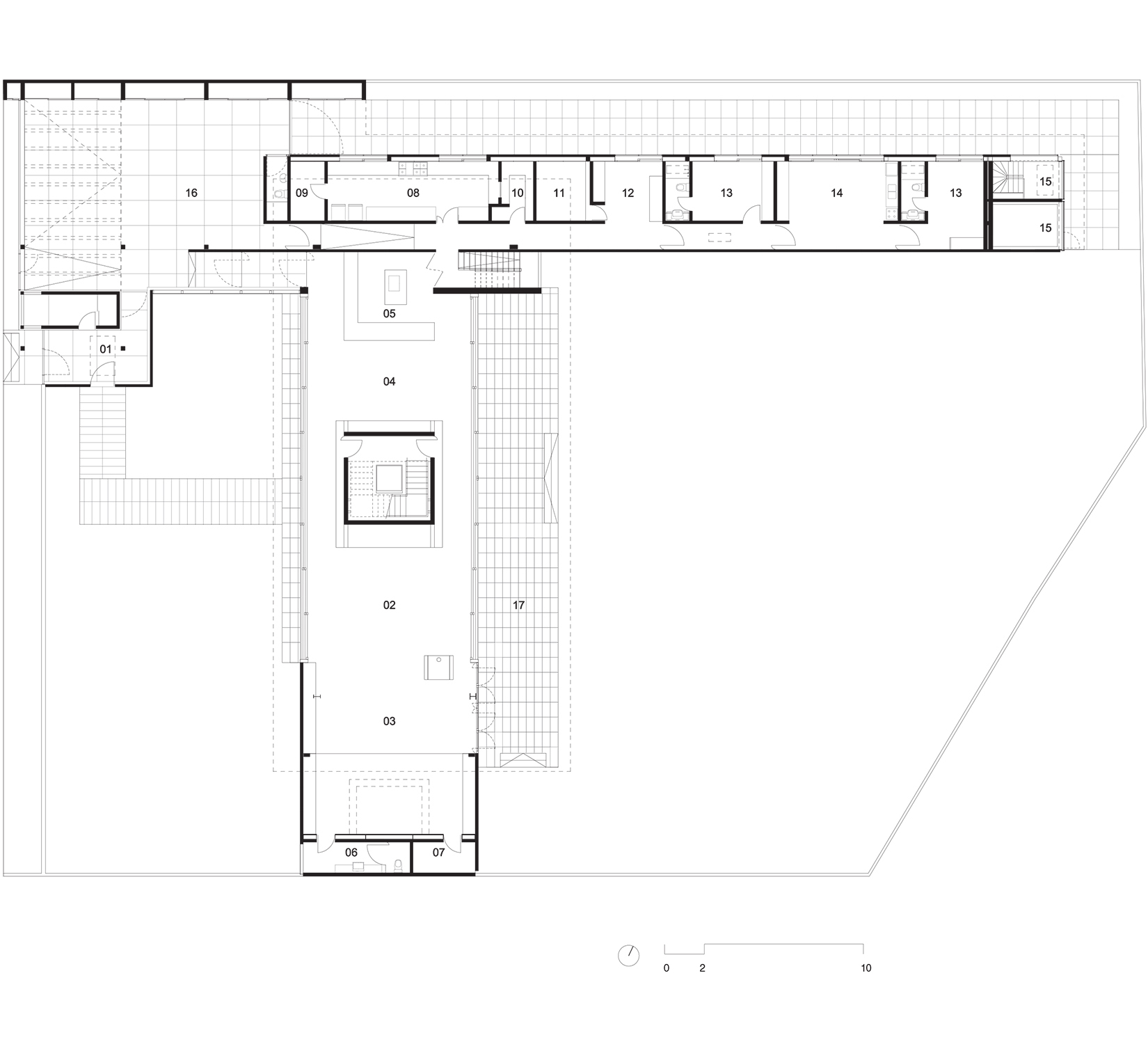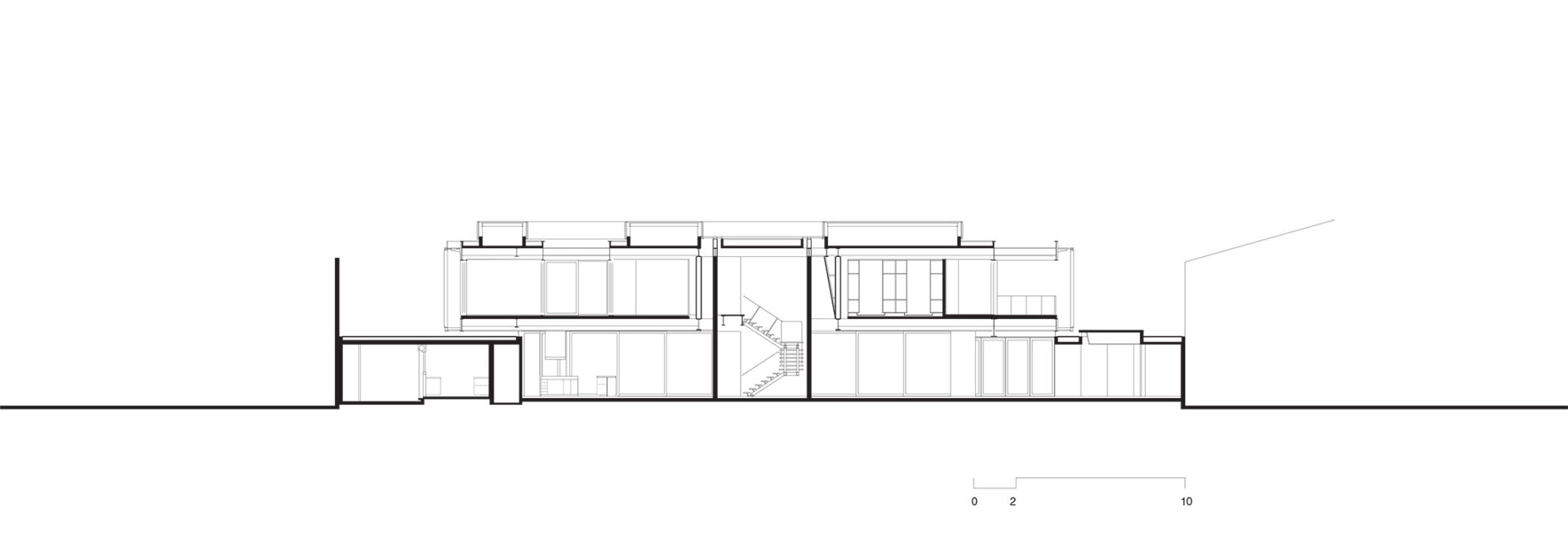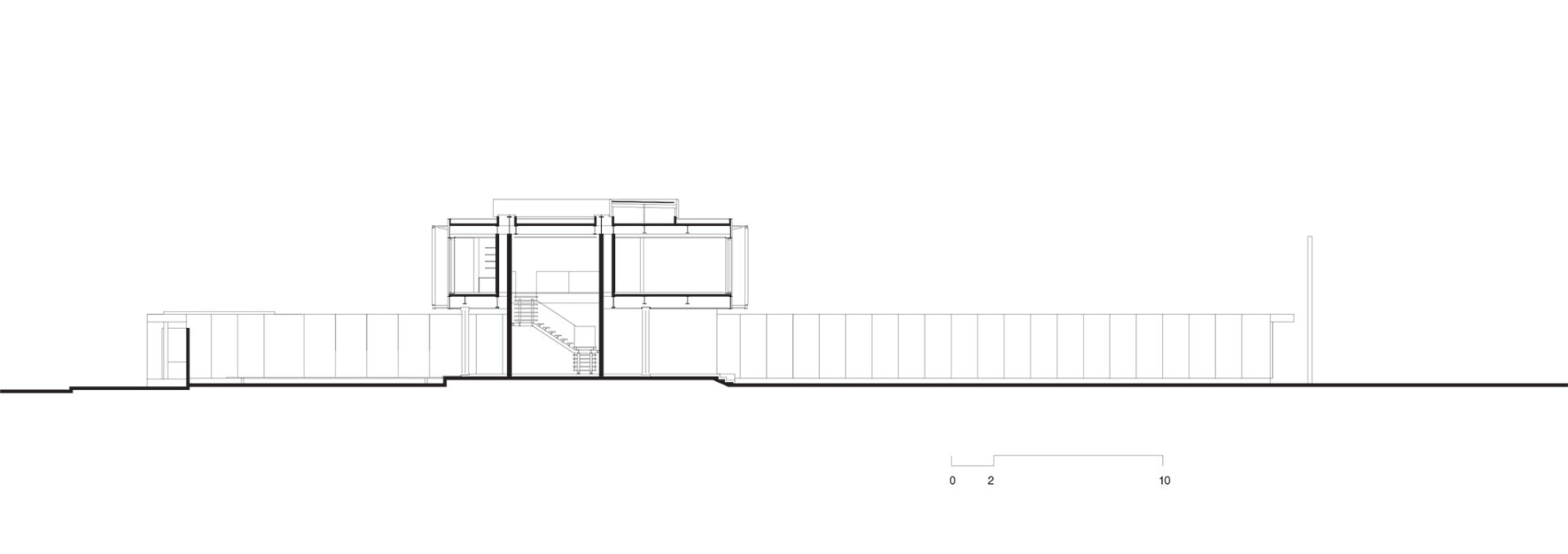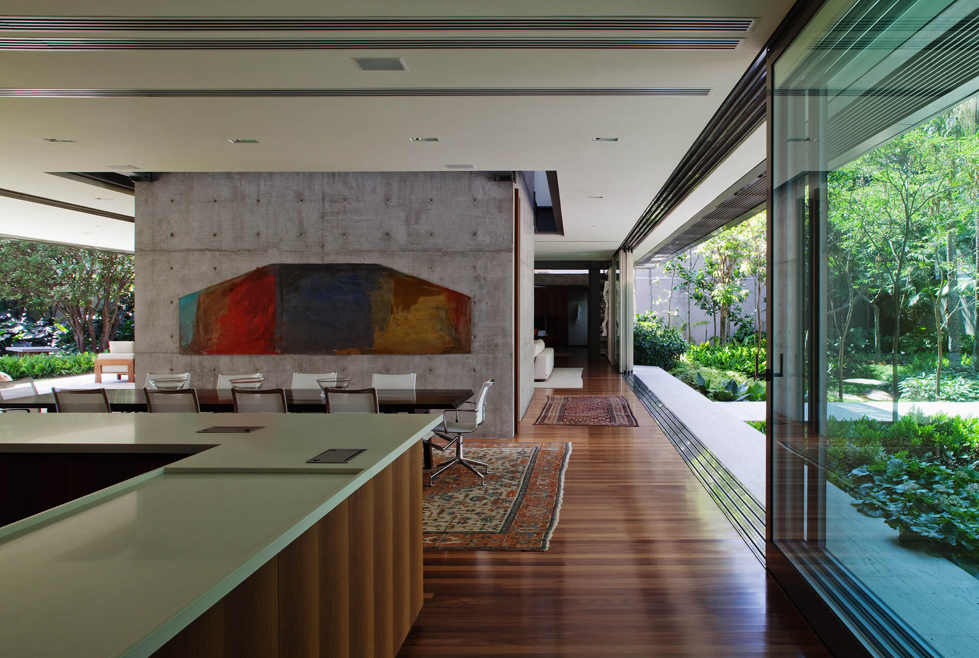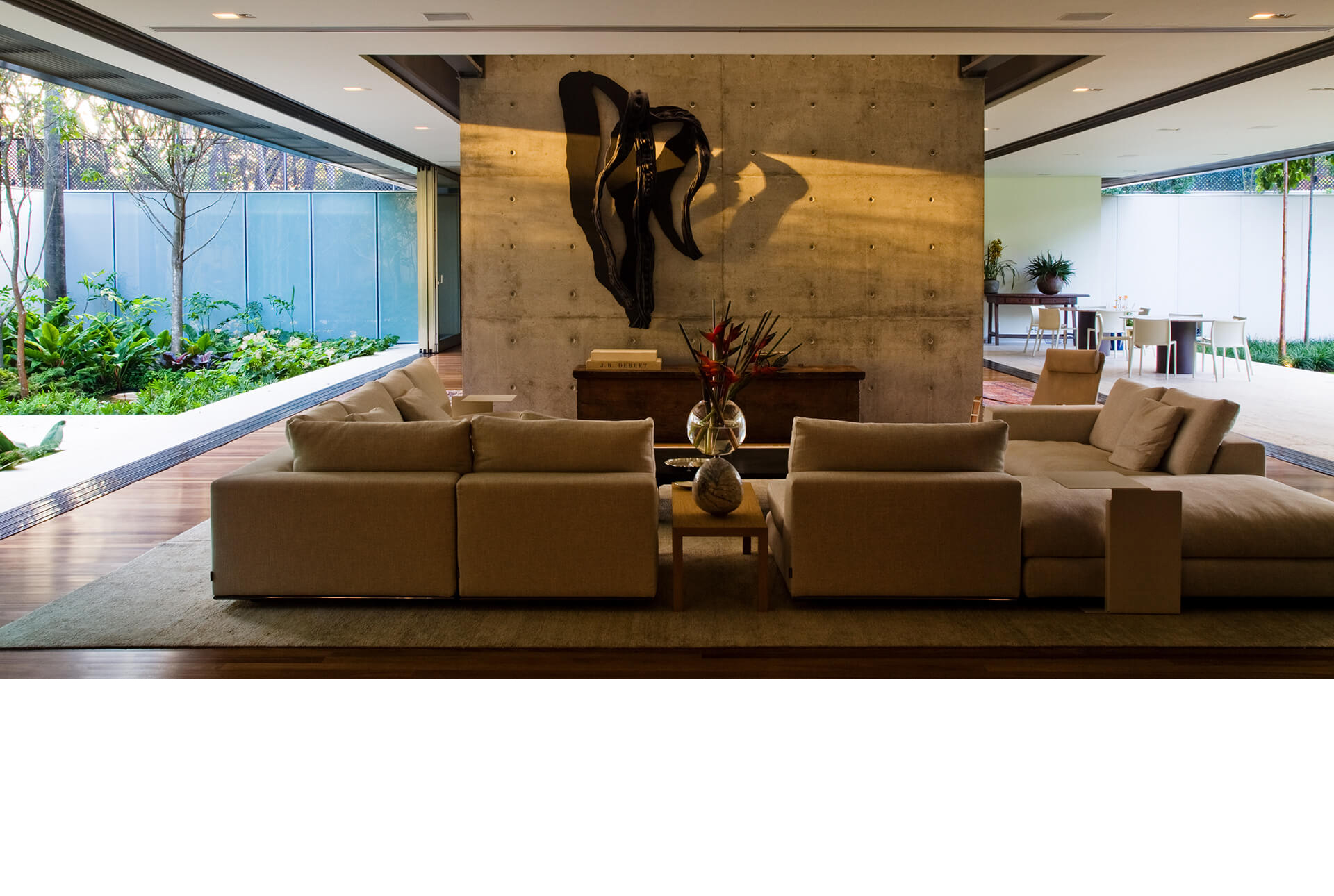 No térreo, os espaços de convívio estão localizados sob a sombra do volume superior da casa, conectados aos jardins através de uma grande varanda e das portas decorrer de vidro — que podem ser recolhidas totalmente, criando uma abertura de 14m de largura. O volume superior, concebido como uma caixa translúcida, abriga os quartos e outros ambientes que requerem maior privacidade.