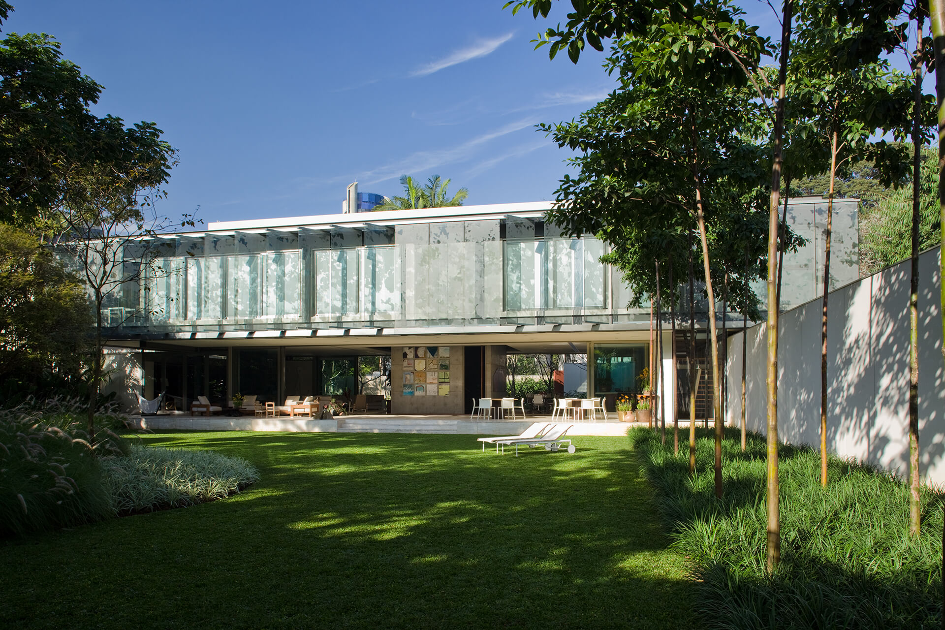 Esta casa, localizada num bairro-jardim da cidade de São Paulo, tira proveito de sua condição privilegiada e faz da integração com a natureza seu traço distintivo. Todos os seus espaços mantêm uma relação clara com o parque de mais de 1.500,00m2 no qual estão inseridos.