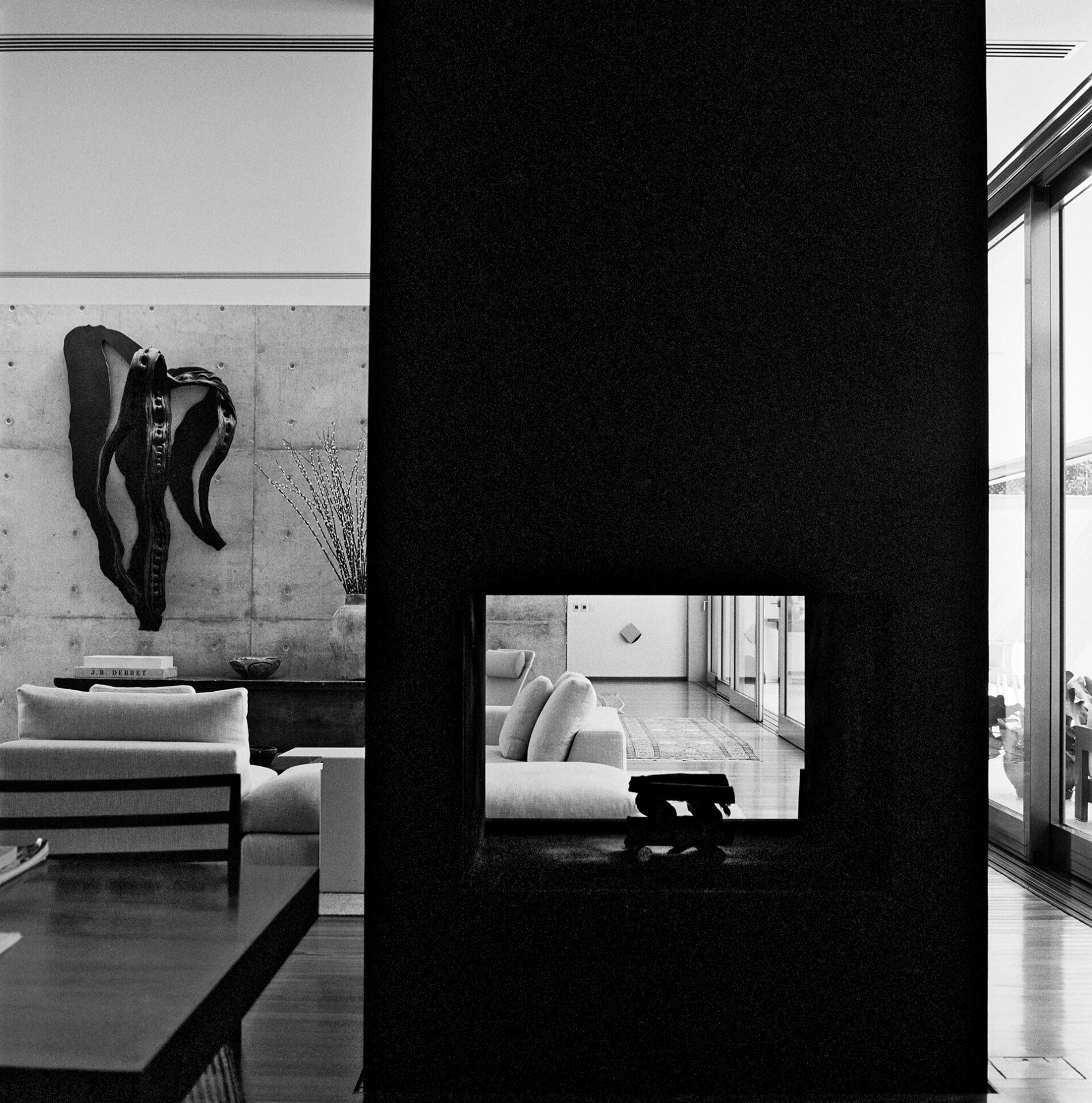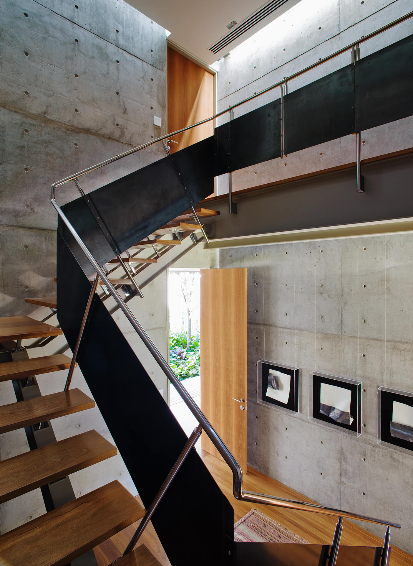 A estrutura do volume de vidro foi concebida de tal maneira que ele parece flutuar sobre o jardim, sustentado pelo pilar central de concreto armado, que abriga também a escada de acesso ao pavimento superior. A articulação entre os planos horizontais e este pilar de sustentação é reforçada pela criação de vazios ao redor de toda a caixa de concreto, que são utilizados também para trazer luz natural da cobertura para o interior da casa.