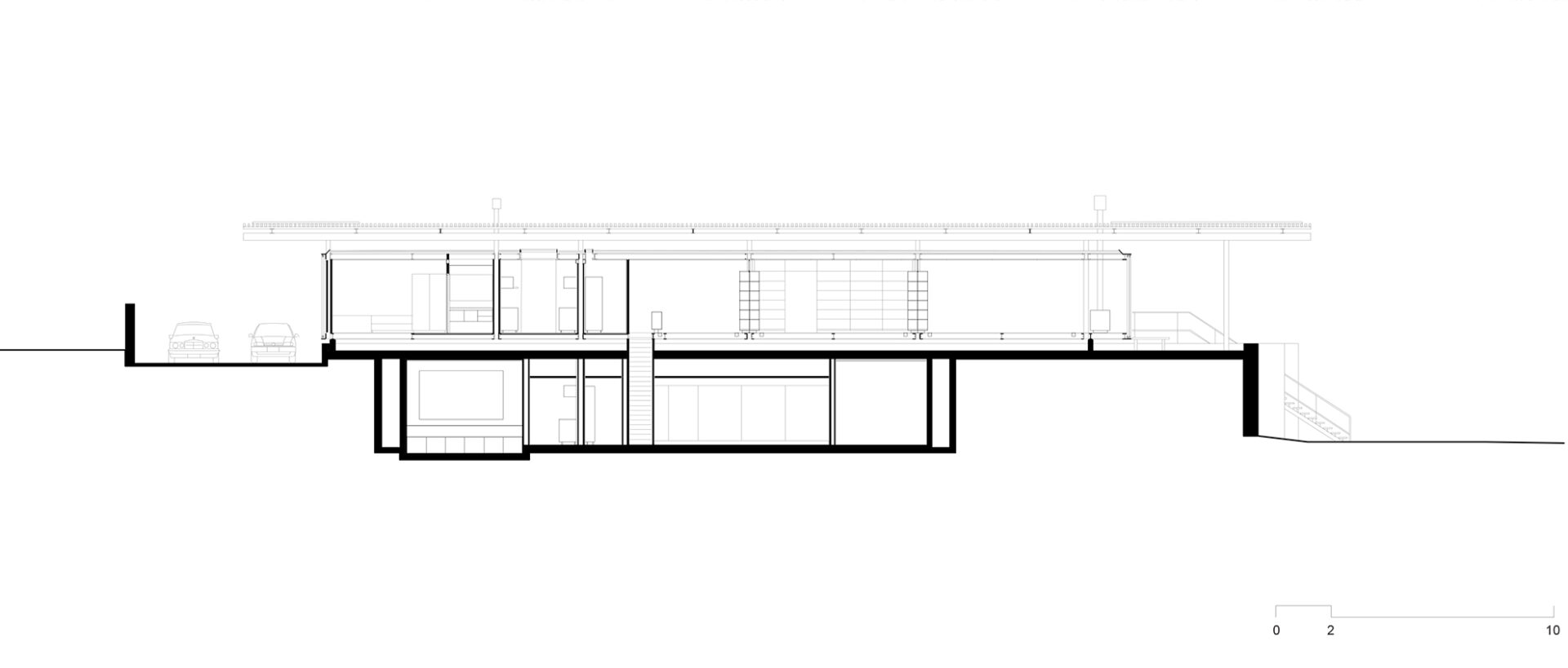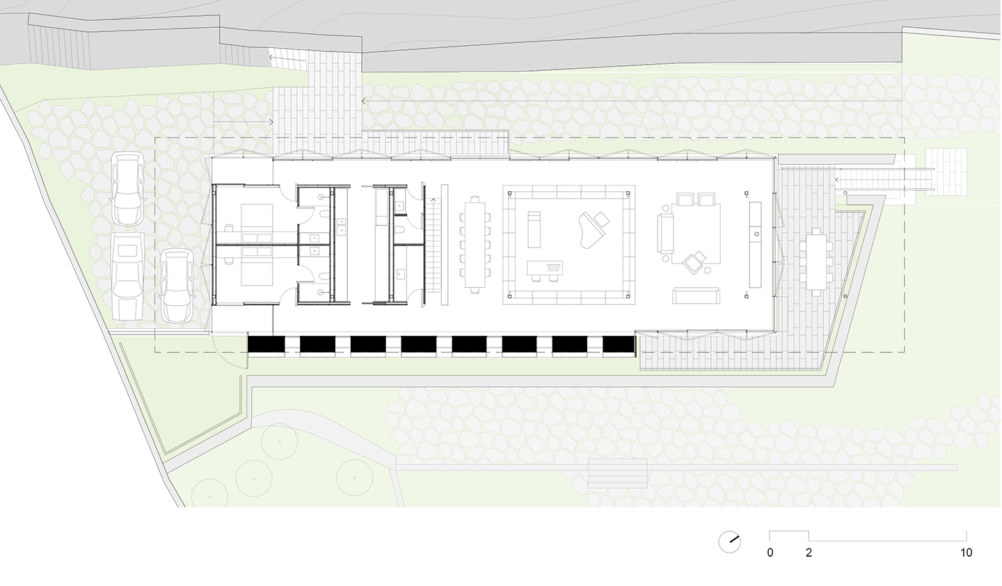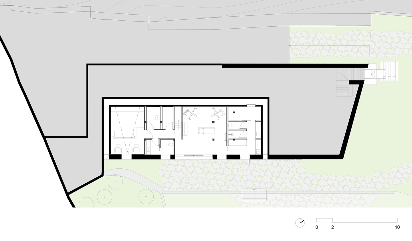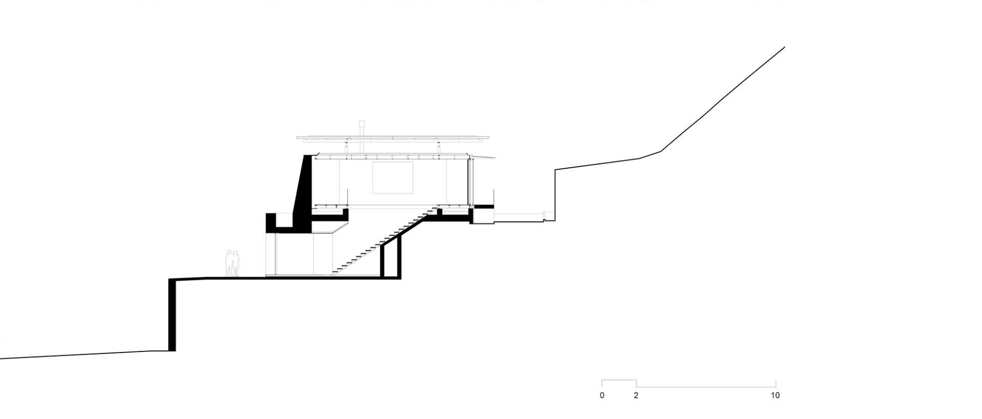Uma construção preexistente, executada em pedra e alvenaria, foi parcialmente demolida para acomodar um volume leve, em forma de pavilhão que se insere sobre os elementos de pedra remanescentes. Essa estratégia, além de revelar-se racional por tirar proveito de grande parte do esforço realizado ali anteriormente, manifesta o desejo de preservação do patrimônio natural e construído.