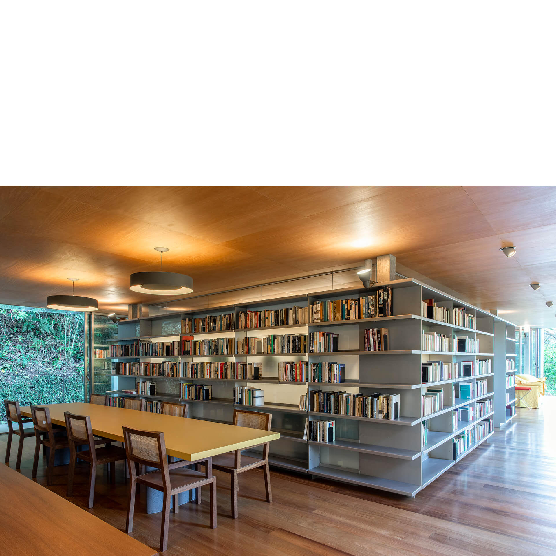 Construído a partir de um esqueleto metálico, o pavilhão foi concebido como uma estrutura leve incorporando componentes pré-fabricados, como o piso e forro de madeira, pérgola de madeira, cobertura de manta impermeabilizante, esquadrias de alumínio, fechamentos externos de vidro e telas mosquiteiro, fechamentos internos de painéis de madeira e estantes da biblioteca de aço.