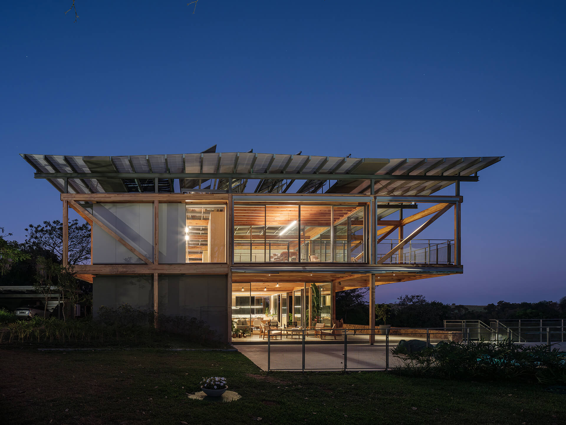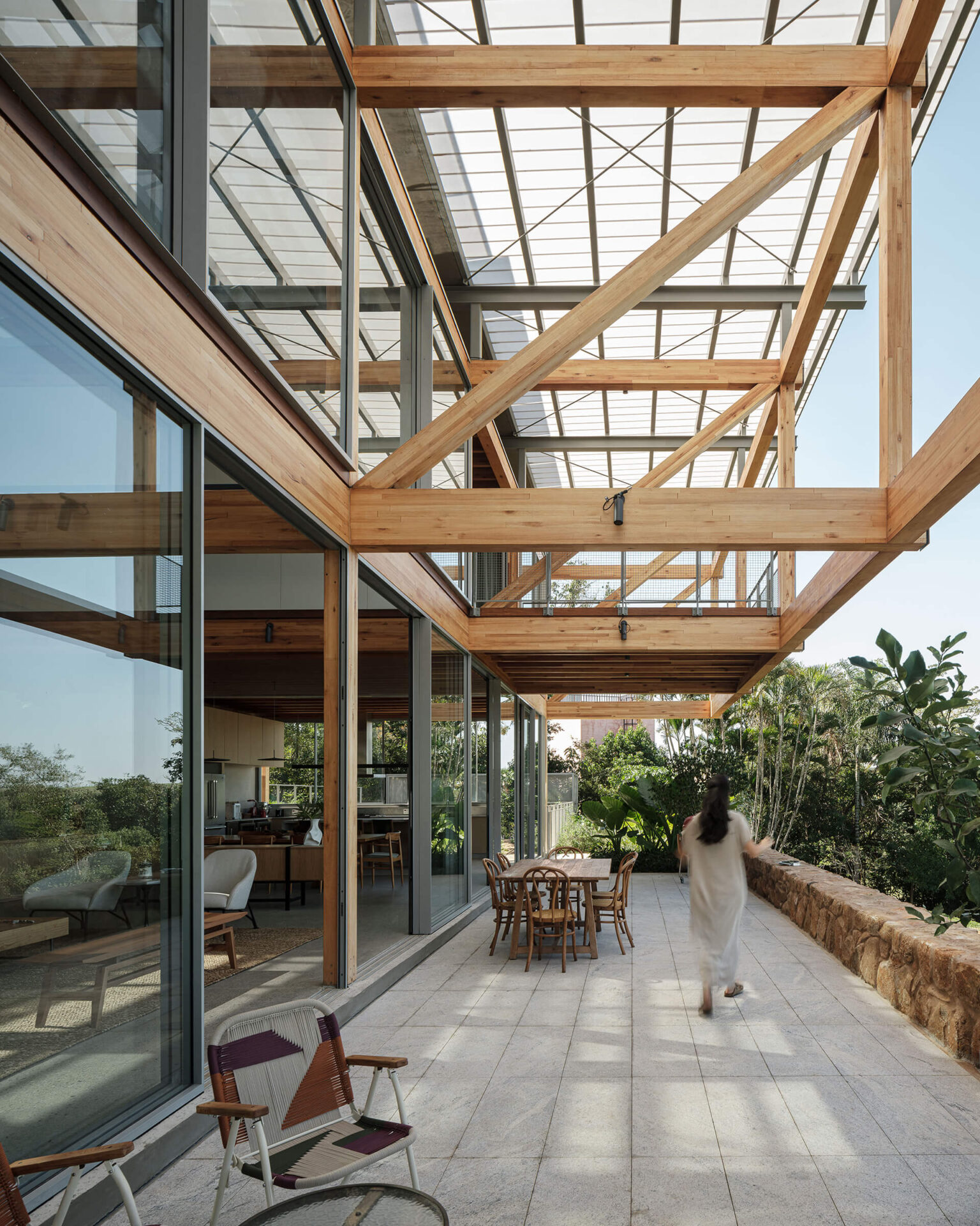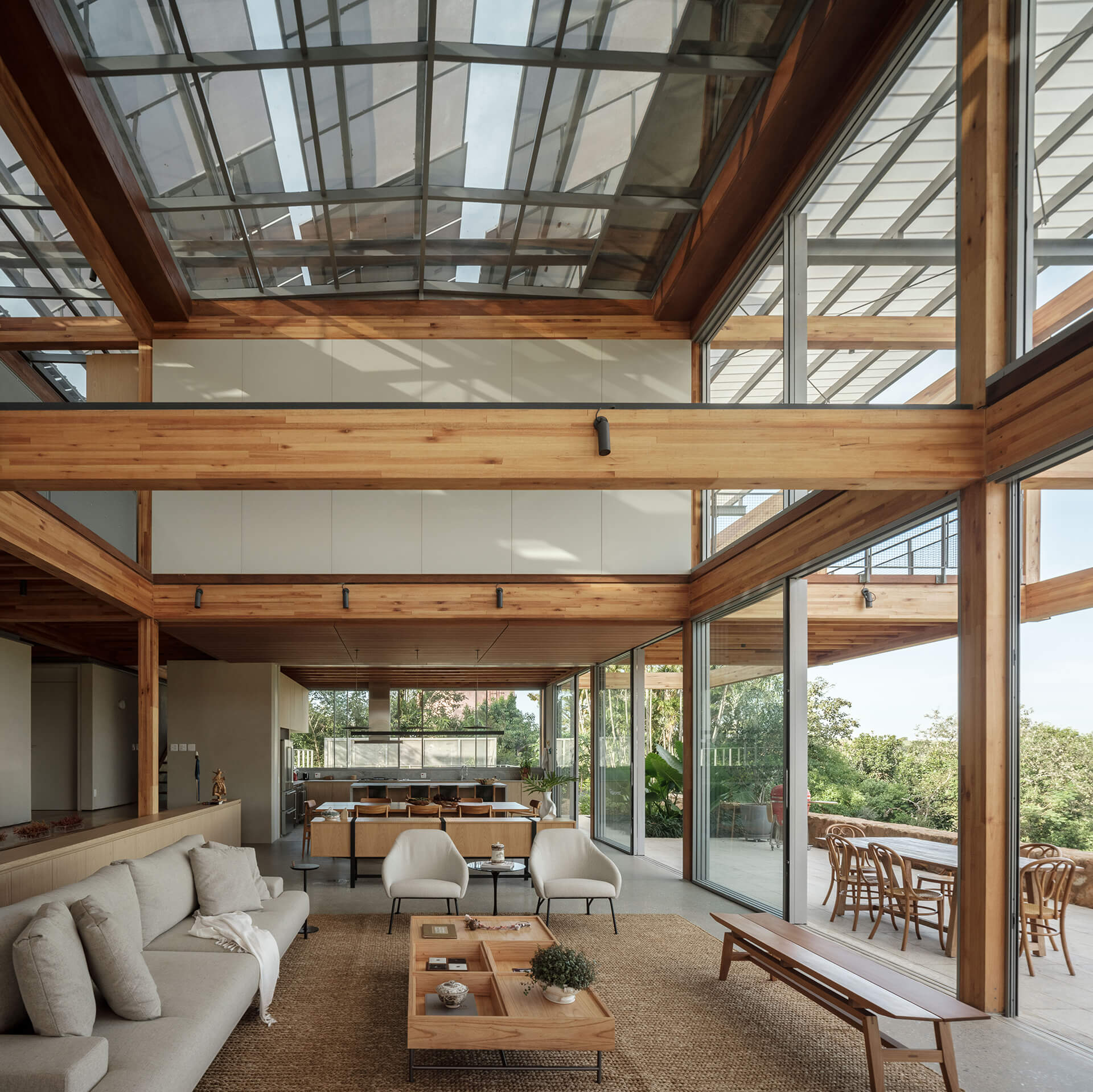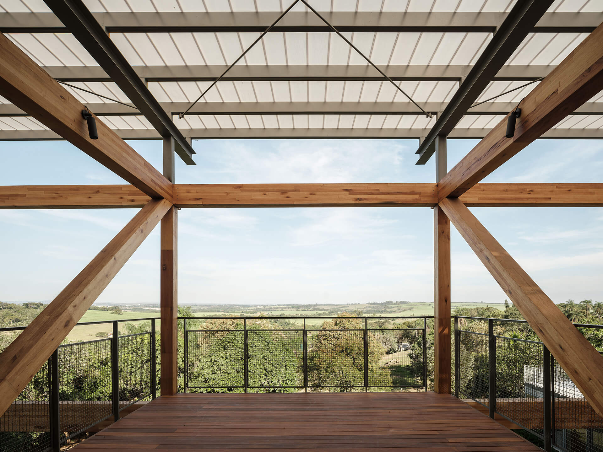 O volume principal da casa foi resolvido por um grid estrutural de madeira laminada colada (MLC), que se apoia em torno da área de estar central e lança balanços ao norte e ao sul, criando os suportes para os dormitórios, o escritório e os terraços suspensos, com vista privilegiada para o vale. Uma ampla cobertura translúcida de policarbonato alveolar, apoiada em perfis metálicos leves, protege a casa do excesso de sol, enquanto permite a entrada de luz natural, especialmente na área central, iluminada por uma ampla claraboia.