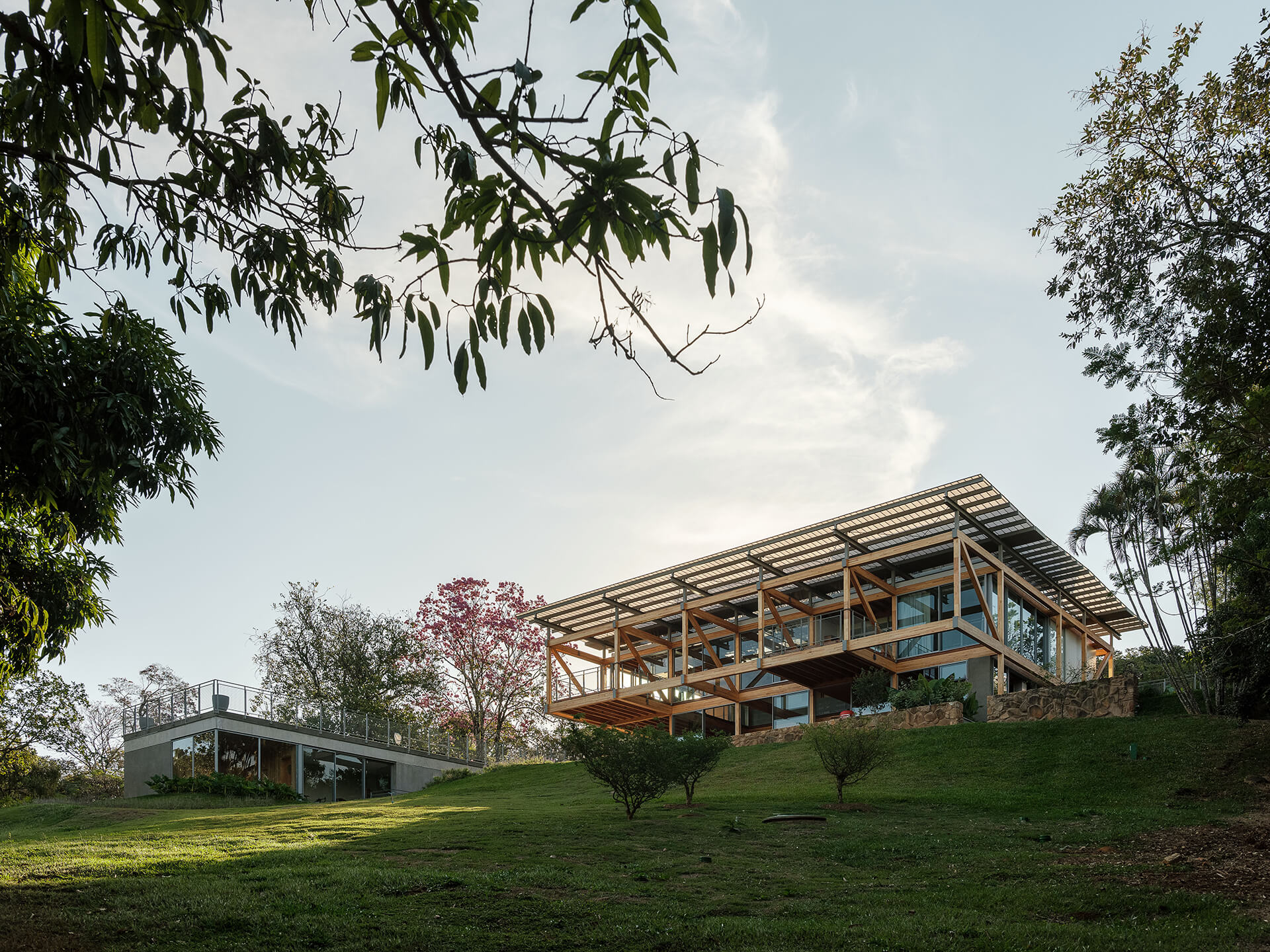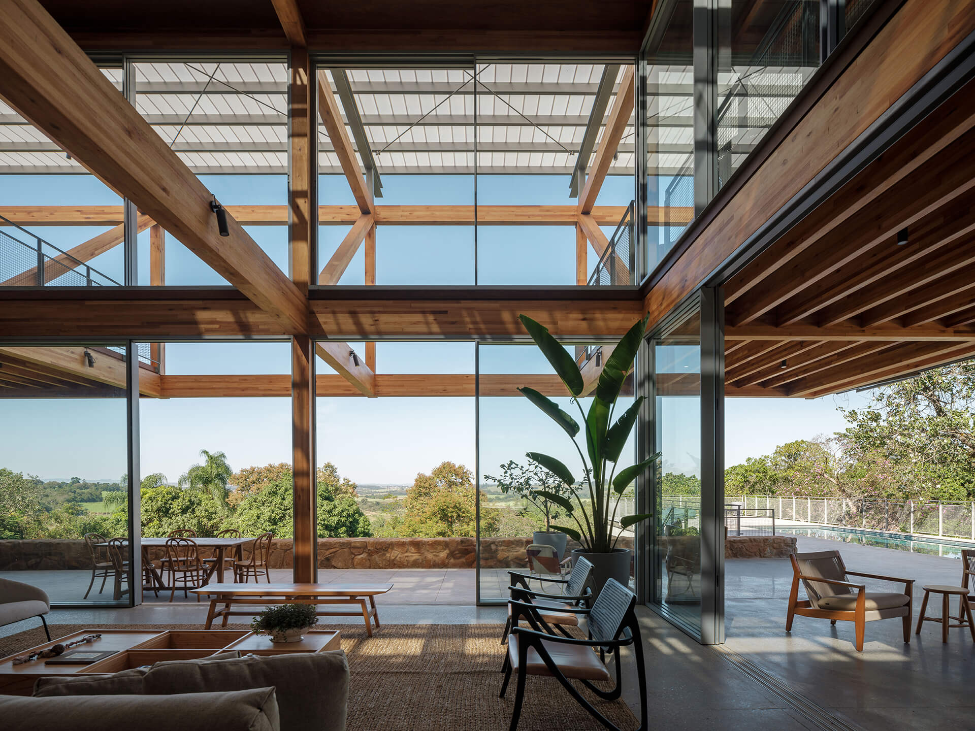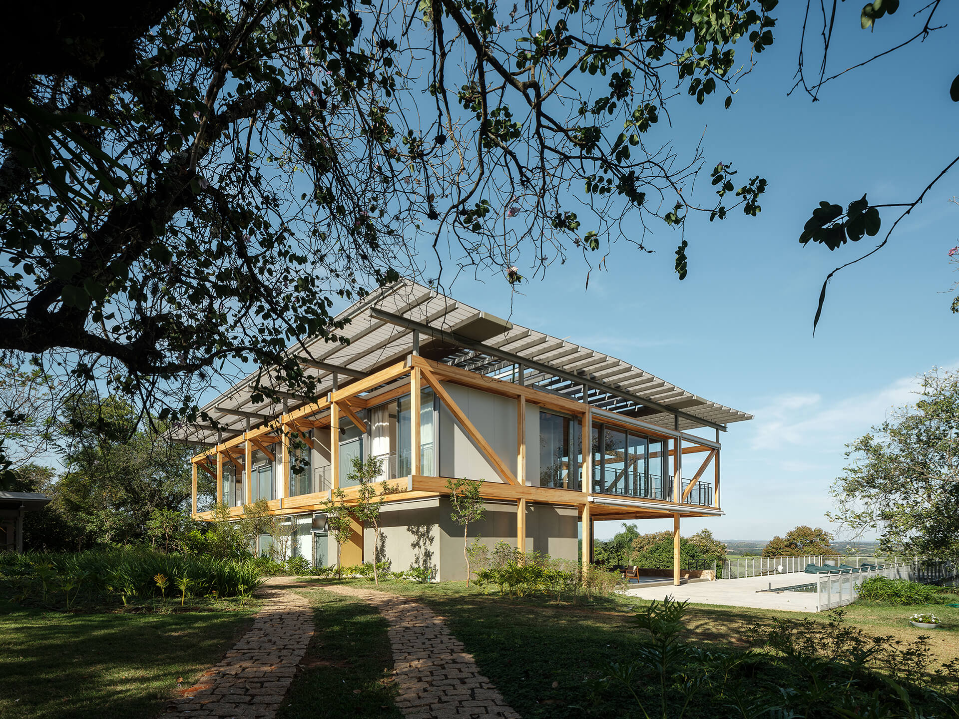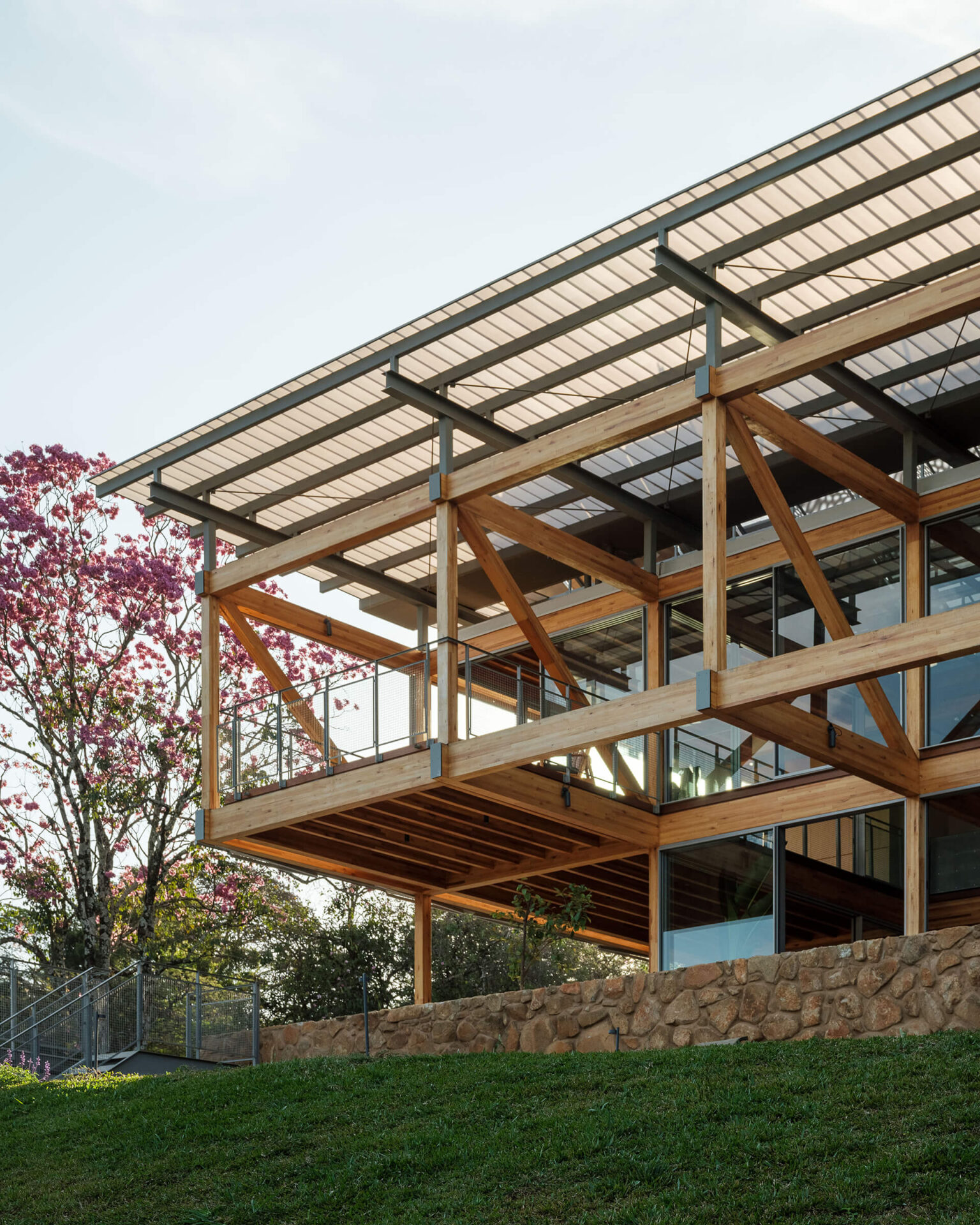 O volume principal da casa foi resolvido por um grid estrutural de madeira laminada colada (MLC), que se apoia em torno da área de estar central e lança balanços ao norte e ao sul, criando os suportes para os dormitórios, o escritório e os terraços suspensos, com vista privilegiada para o vale. Uma ampla cobertura translúcida de policarbonato alveolar, apoiada em perfis metálicos leves, protege a casa do excesso de sol, enquanto permite a entrada de luz natural, especialmente na área central, iluminada por uma ampla claraboia.