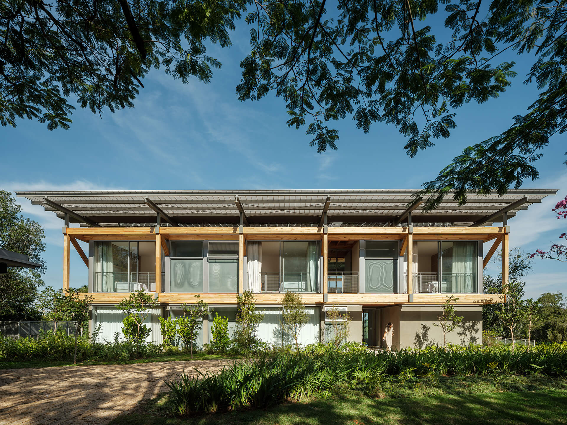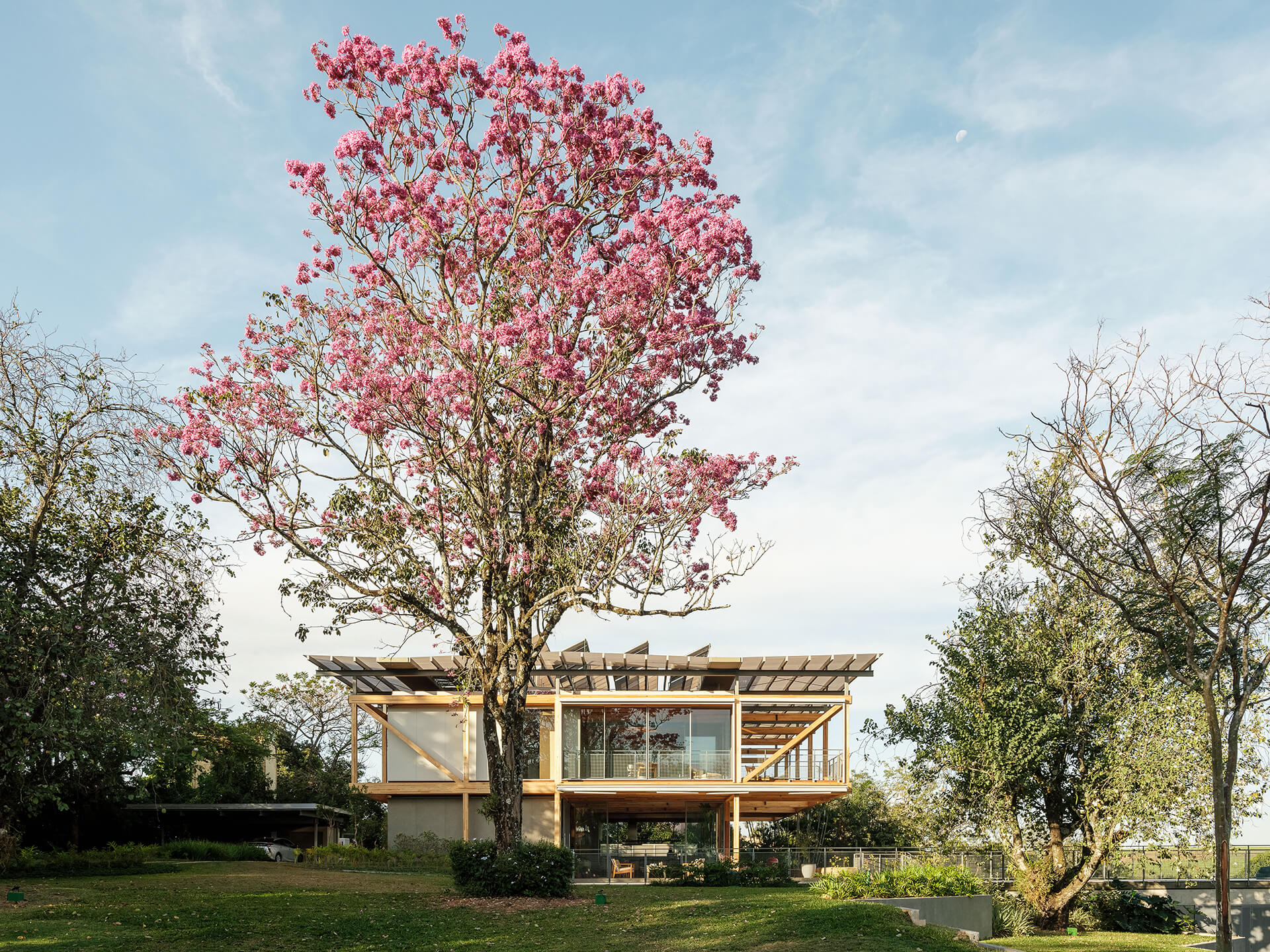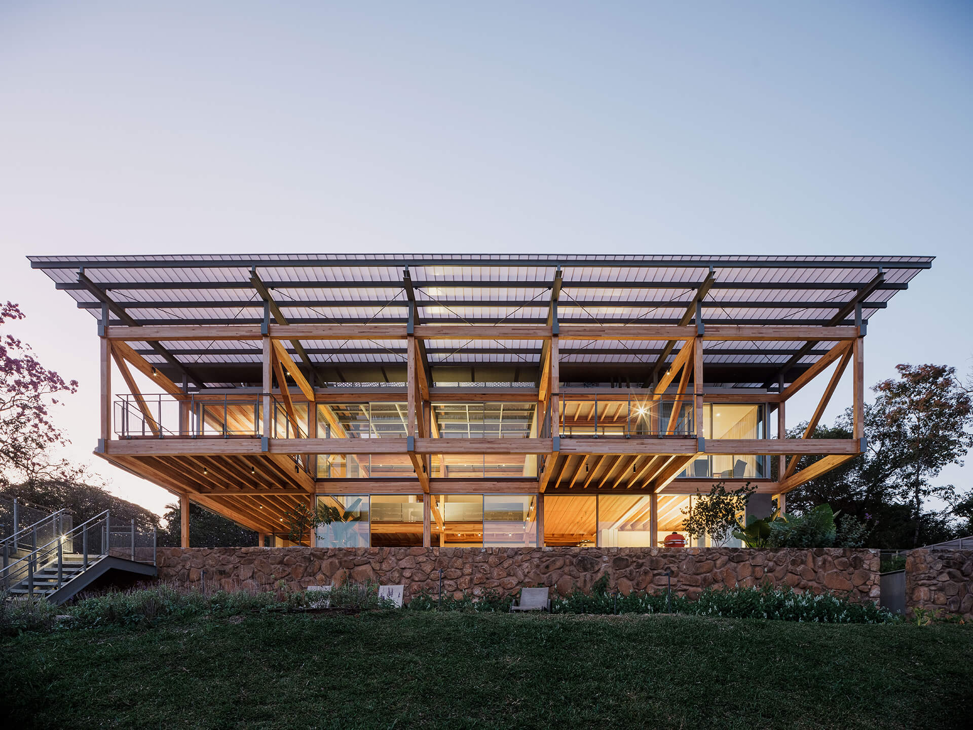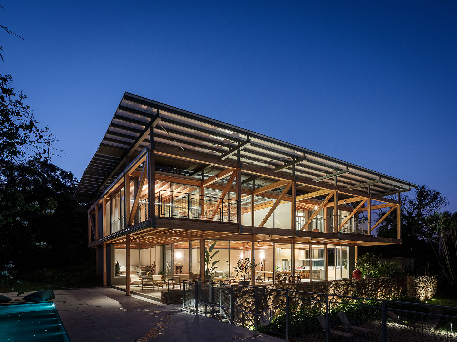 O volume principal da casa foi resolvido por um grid estrutural de madeira laminada colada (MLC), que se apoia em torno da área de estar central e lança balanços ao norte e ao sul, criando os suportes para os dormitórios, o escritório e os terraços suspensos, com vista privilegiada para o vale. Uma ampla cobertura translúcida de policarbonato alveolar, apoiada em perfis metálicos leves, protege a casa do excesso de sol, enquanto permite a entrada de luz natural, especialmente na área central, iluminada por uma ampla claraboia.