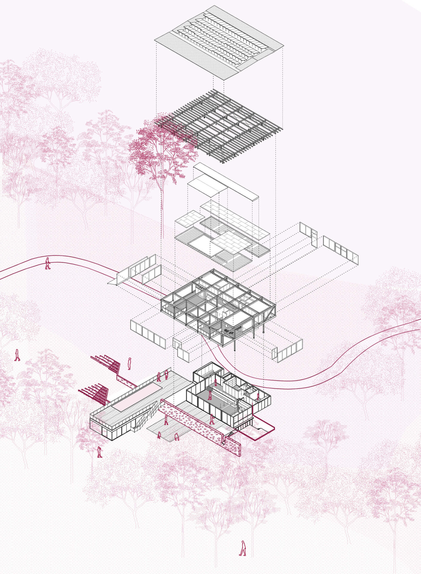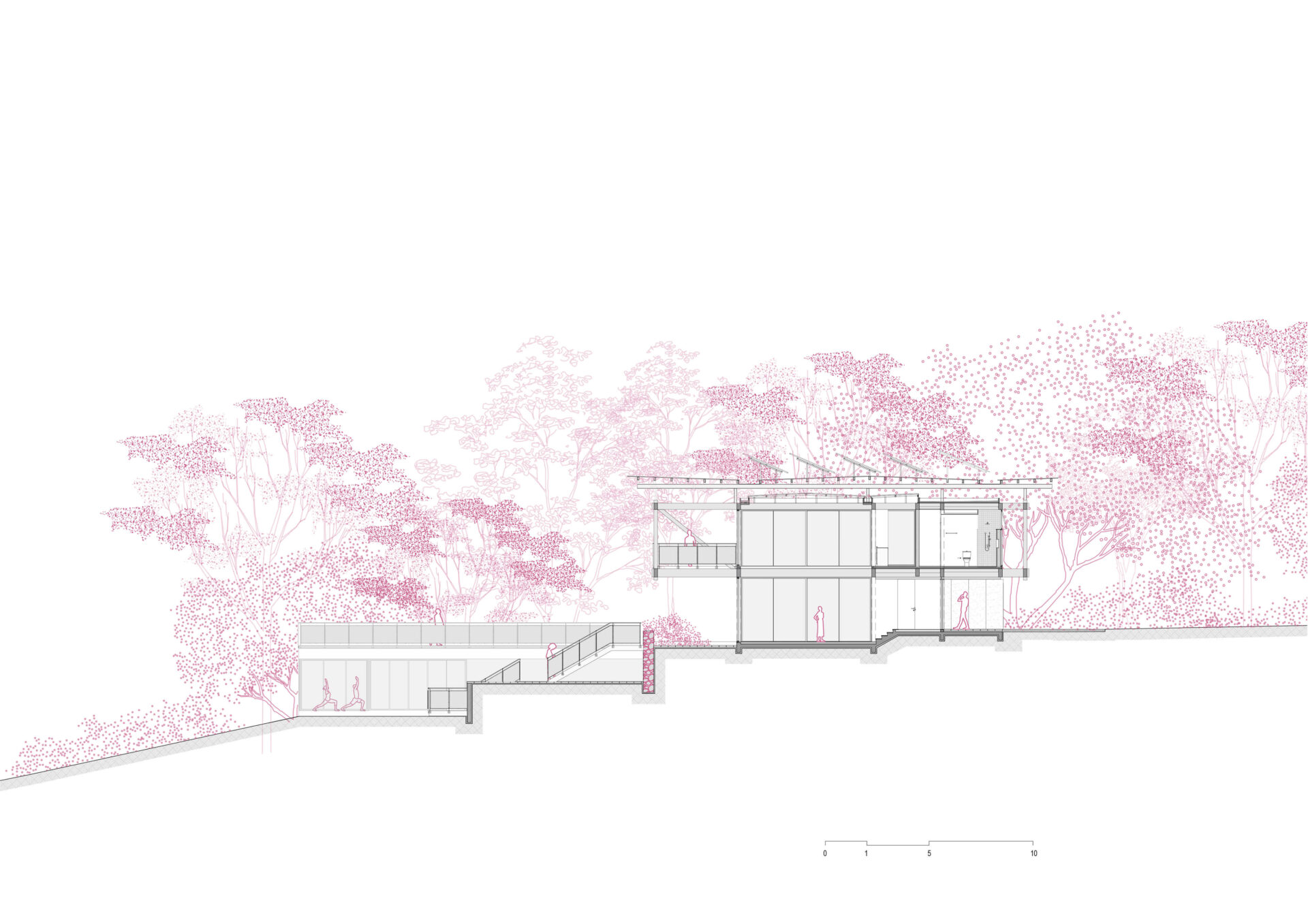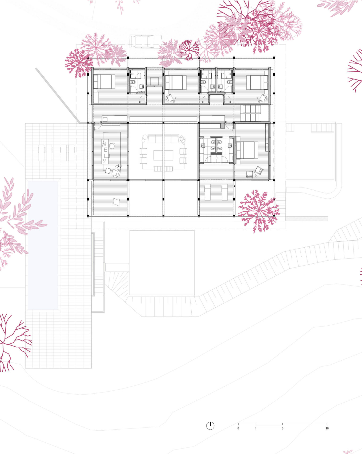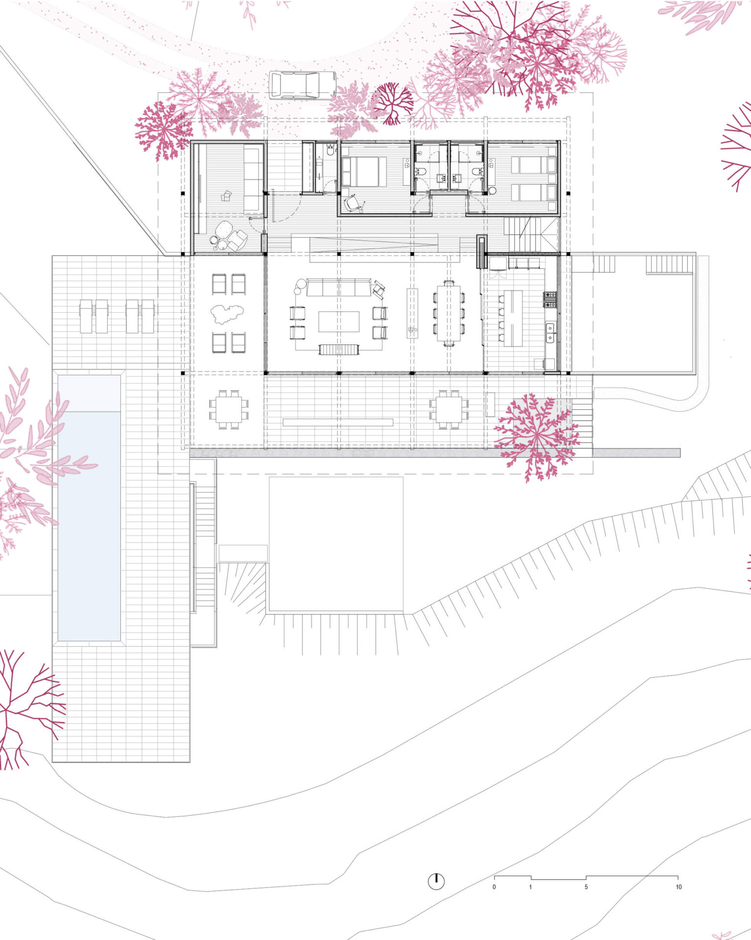 O projeto se organiza em torno da área de estar central com pé-direito duplo, localizada no platô mais alto, delimitado pelo muro de pedra. As demais áreas de vivência estão integradas a essa área central, com destaque para a varanda com vista para o vale, a cozinha aberta e o terraço coberto junto à piscina. Dois quartos de hóspedes, localizados junto à entrada, completam o pavimento térreo.