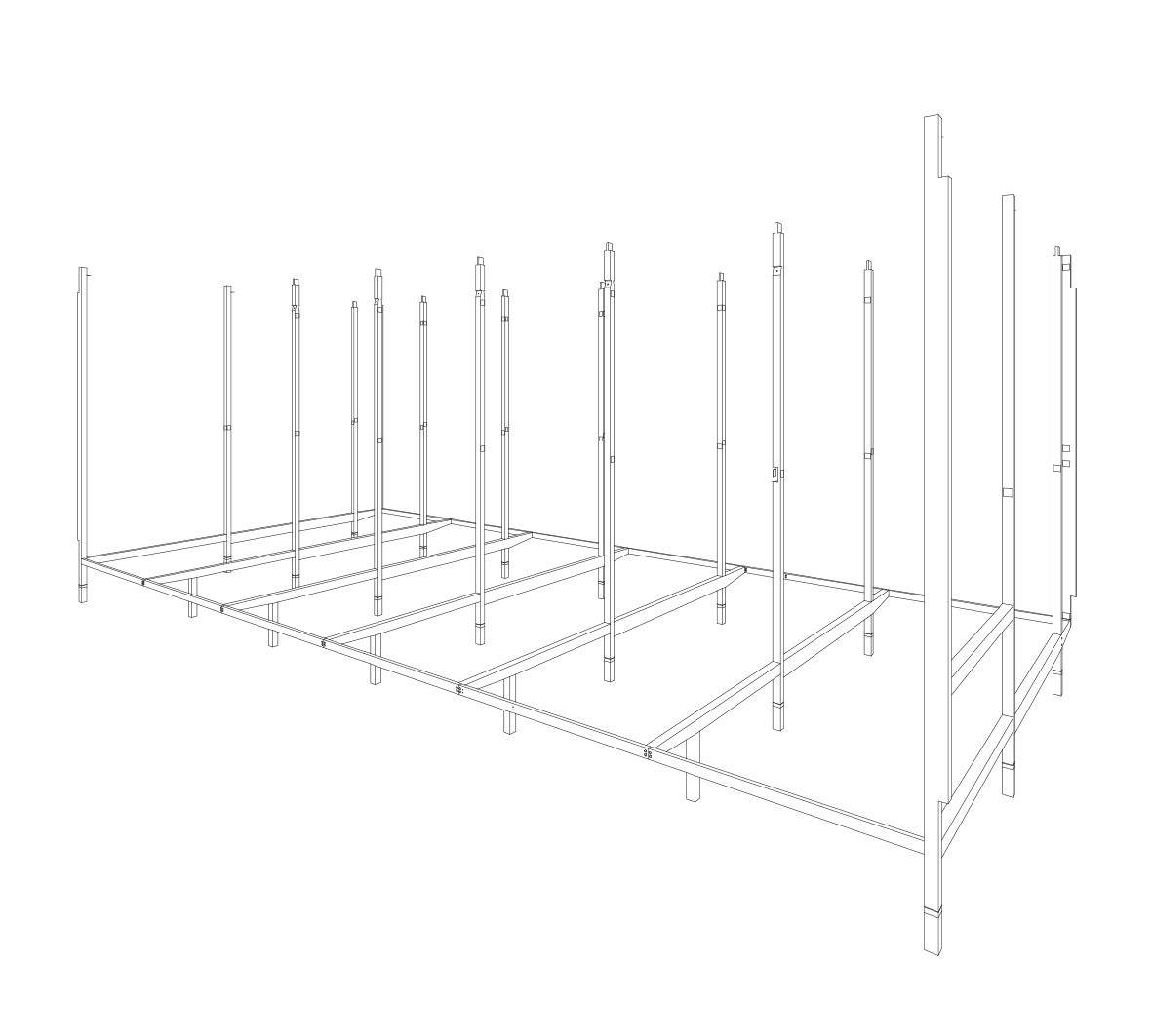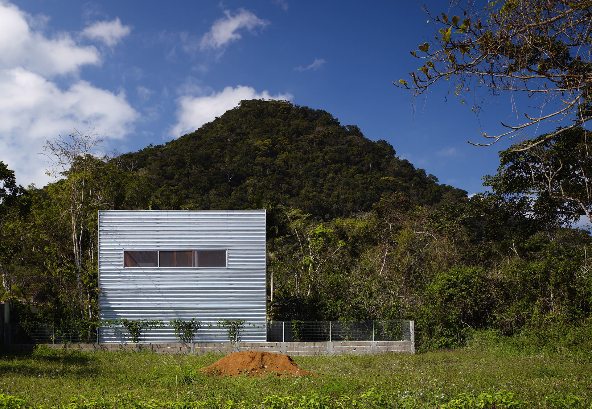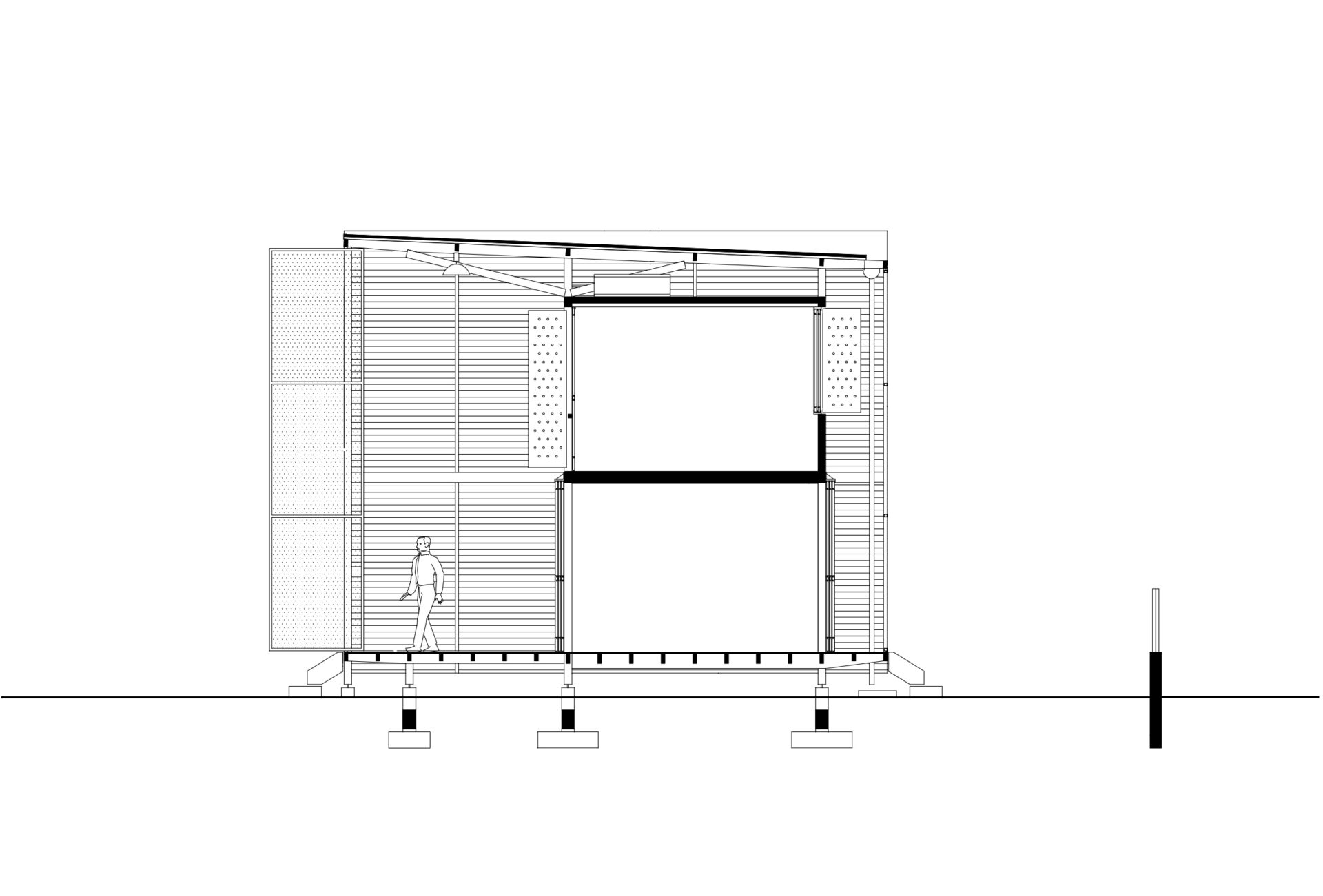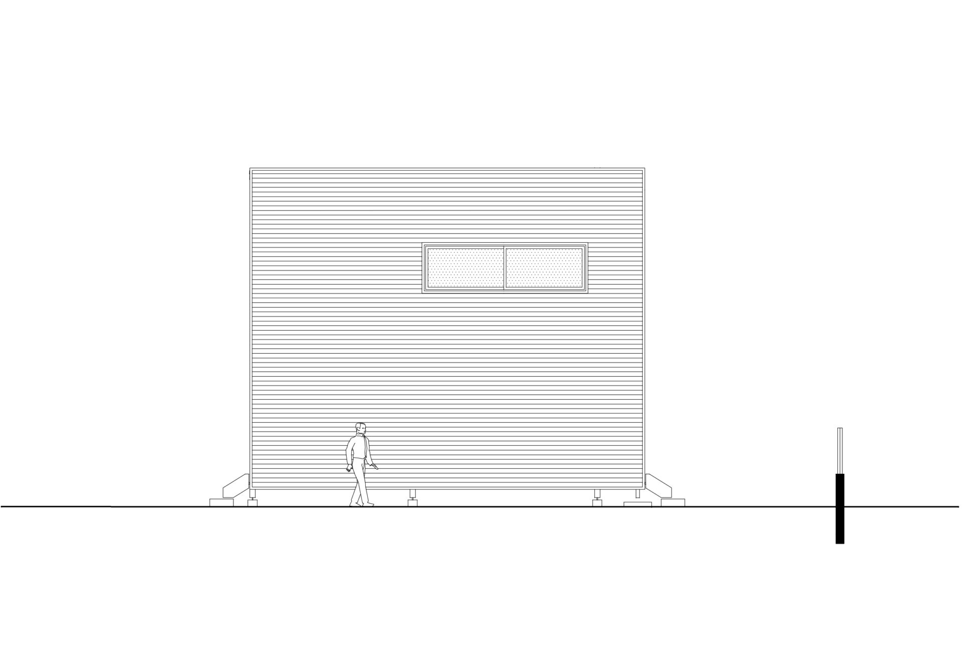 Toda a construção está elevada 75 cm com relação ao solo, apoiada sobre pilotis de concreto moldados no local. Todos os demais componentes utilizados na edificação foram levados prontos e apenas montados no lugar.