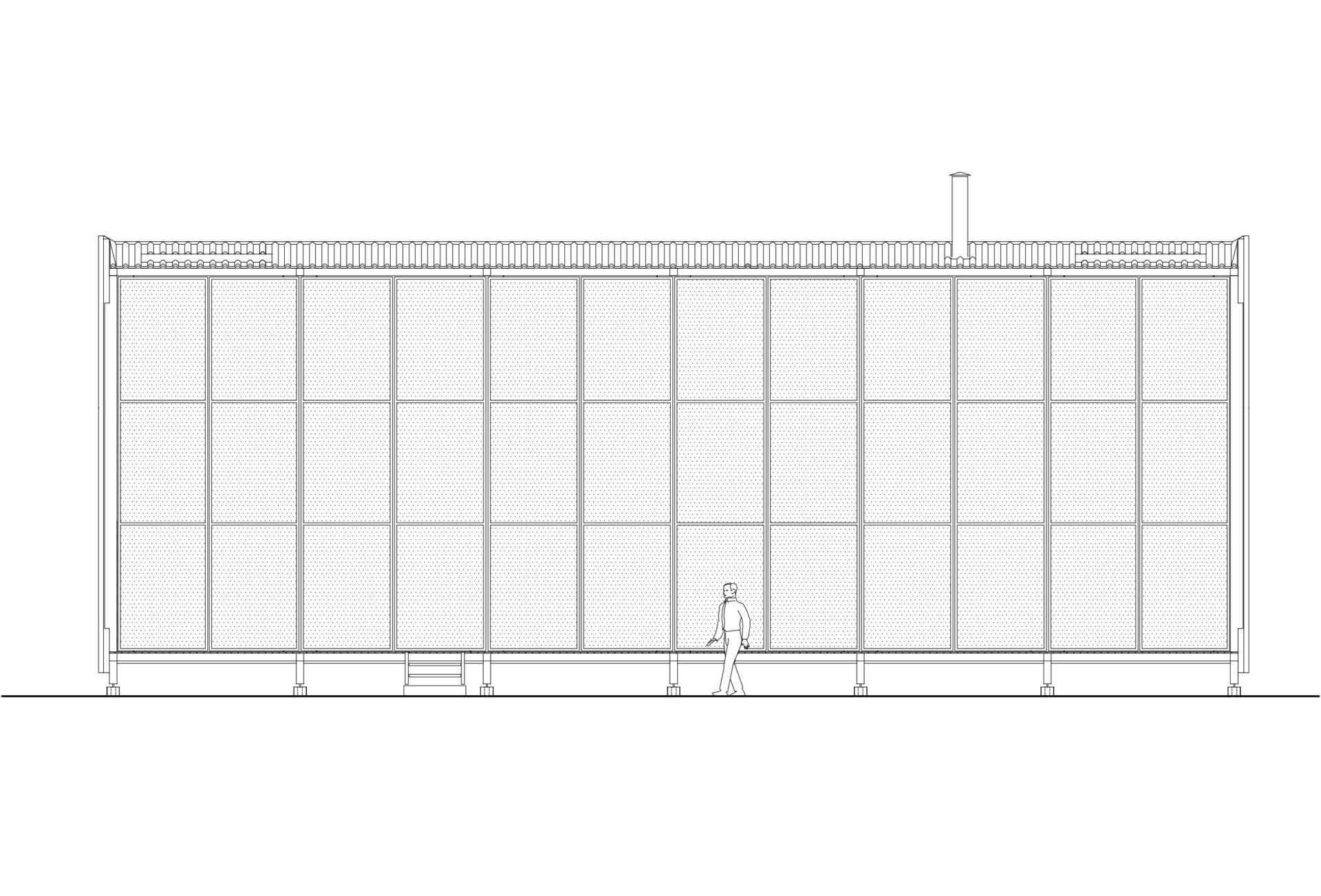 Esta cobertura com seis metros de altura, e dezoito por oito metros de base é construída com estrutura de madeira com juntas de aço galvanizado. Seus fechamentos superior e lateral são feitos por telhas de aço com enchimento de EPS.