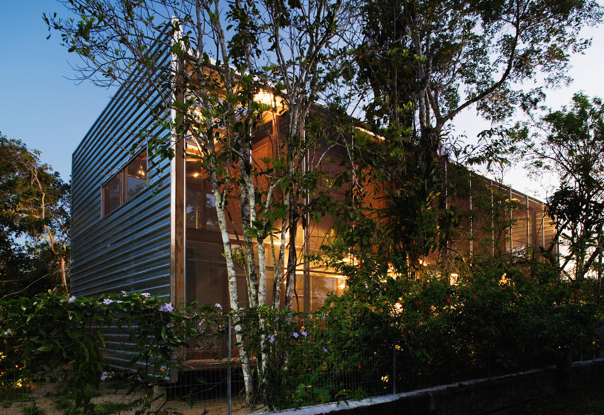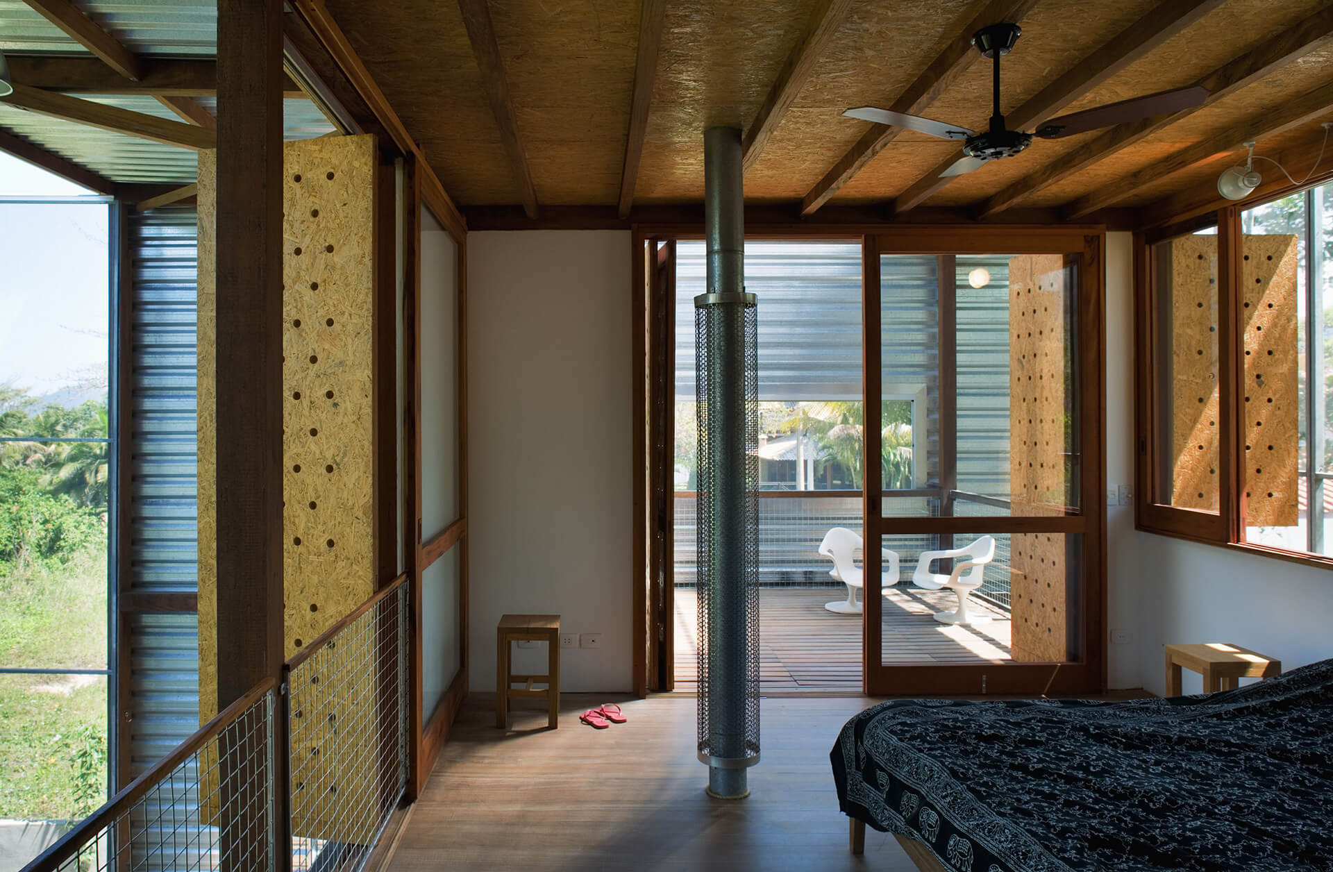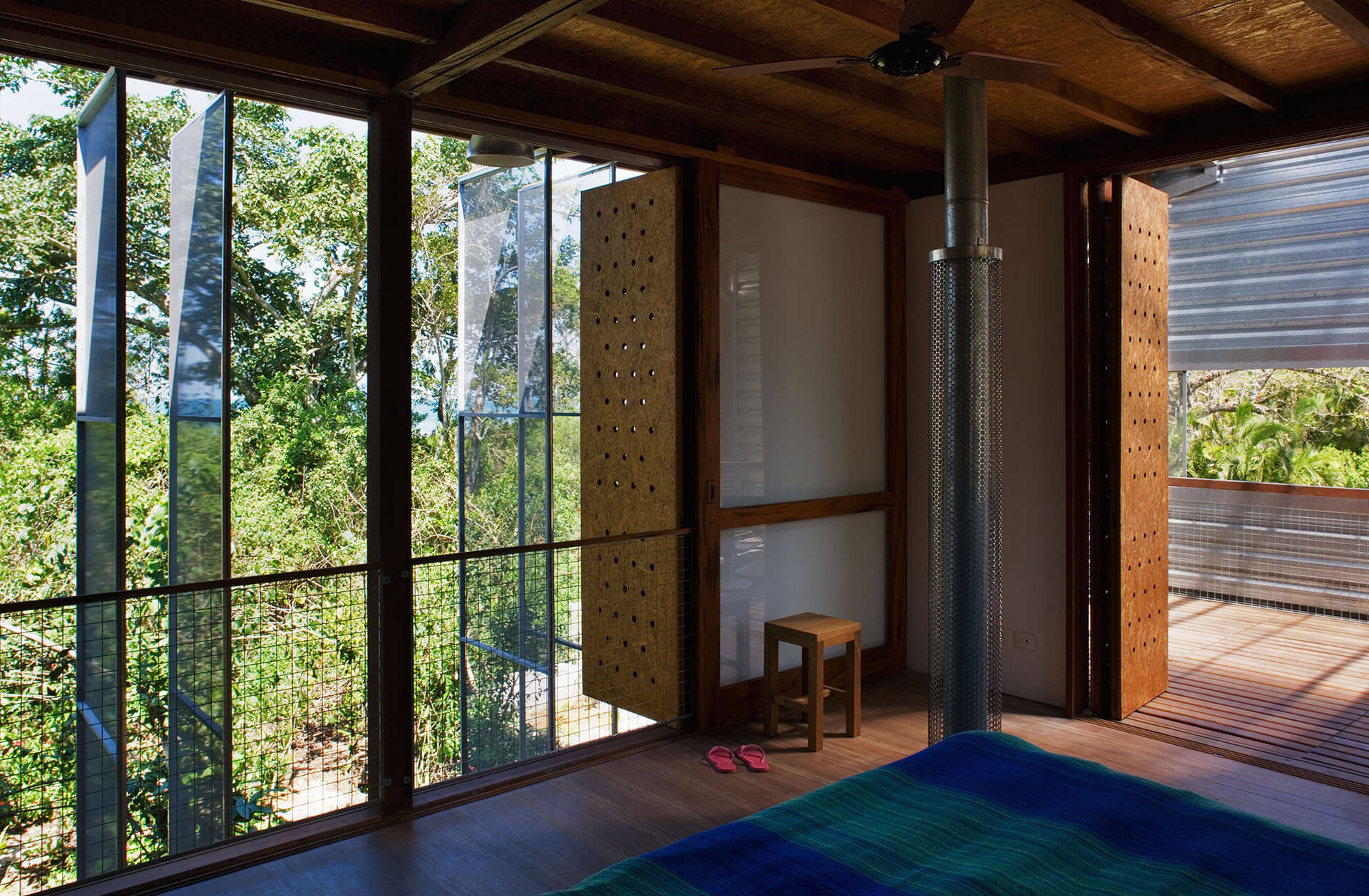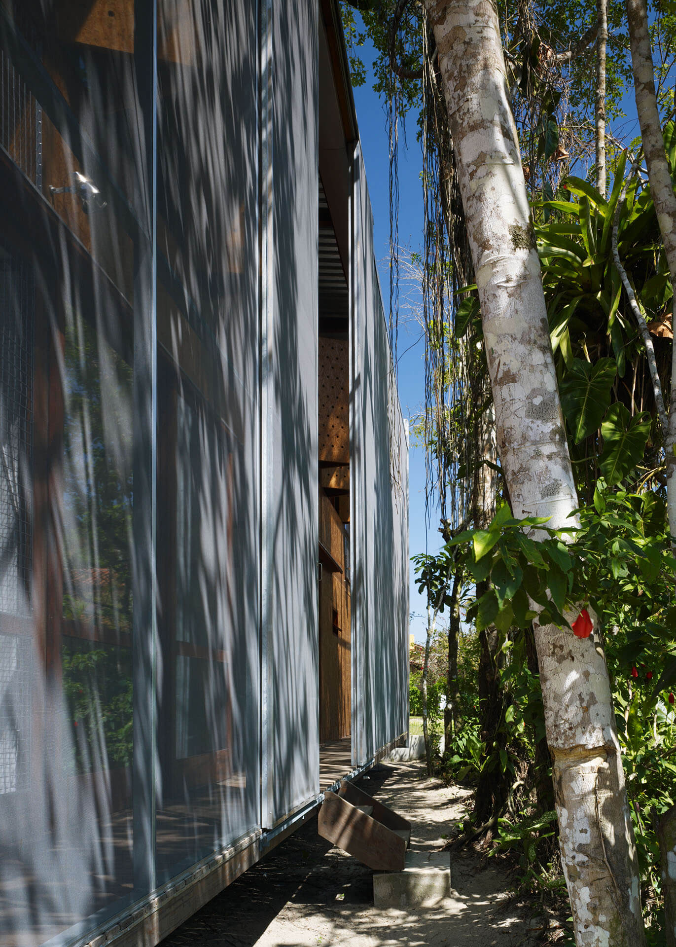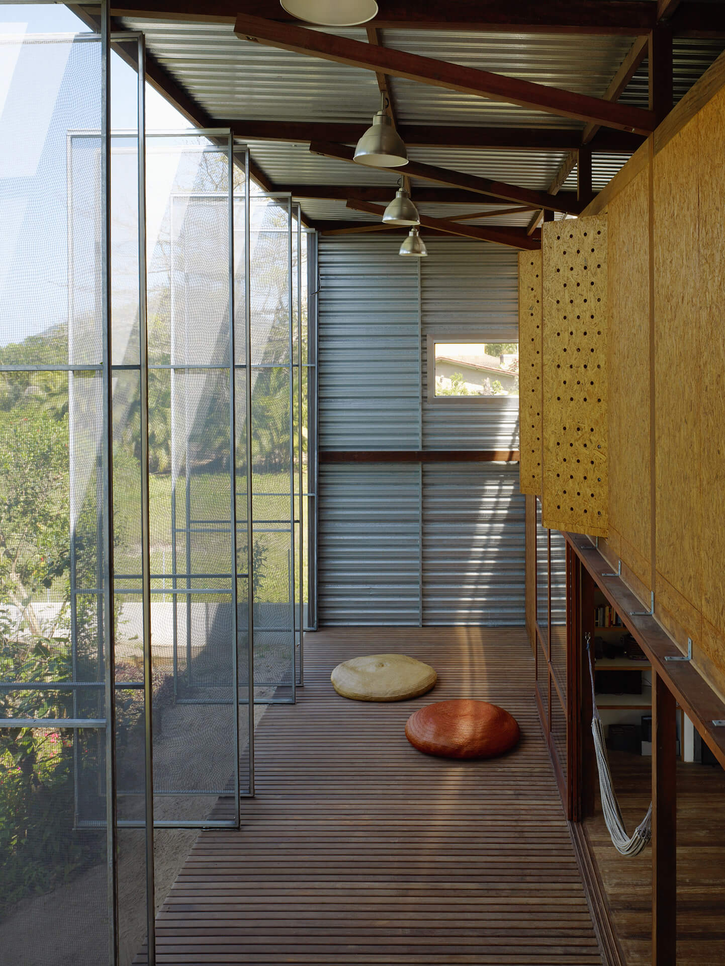 Nas duas fachadas maiores da casa, francamente abertas para a paisagem, foram instalados painéis de telas de fibra de vidro e PVC, montadas em requadros de aço, pivotantes ou deslizantes, com o intuito de criar uma membrana externa, capaz de manter os insetos fora, sem criar obstáculo para a visual ou para a brisa do mar.