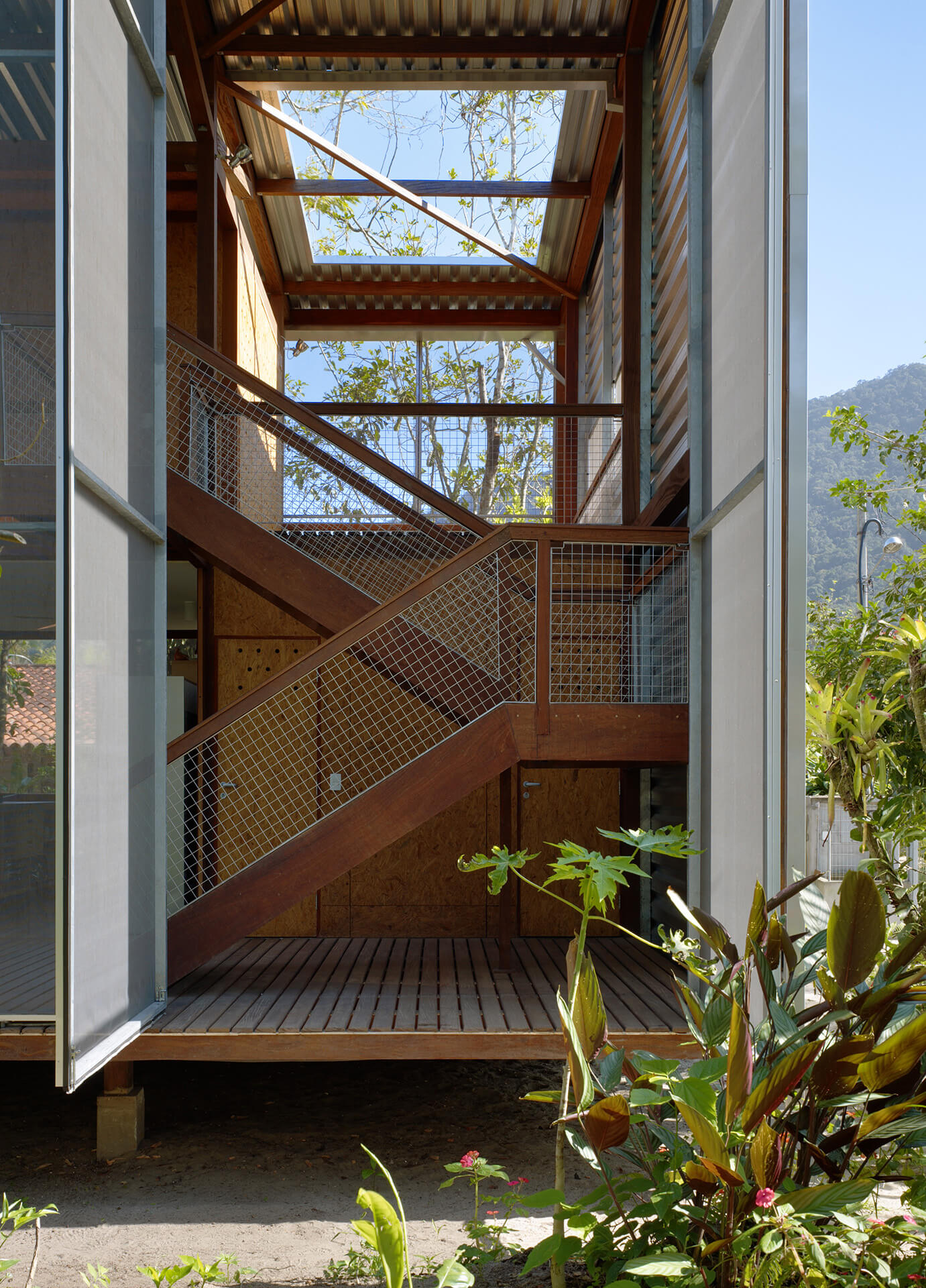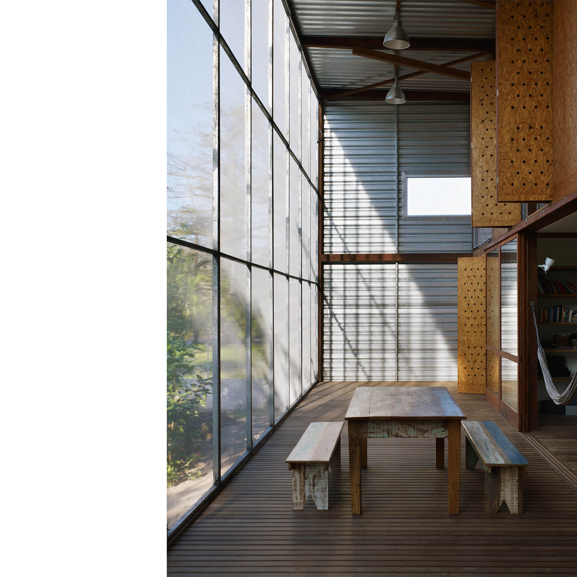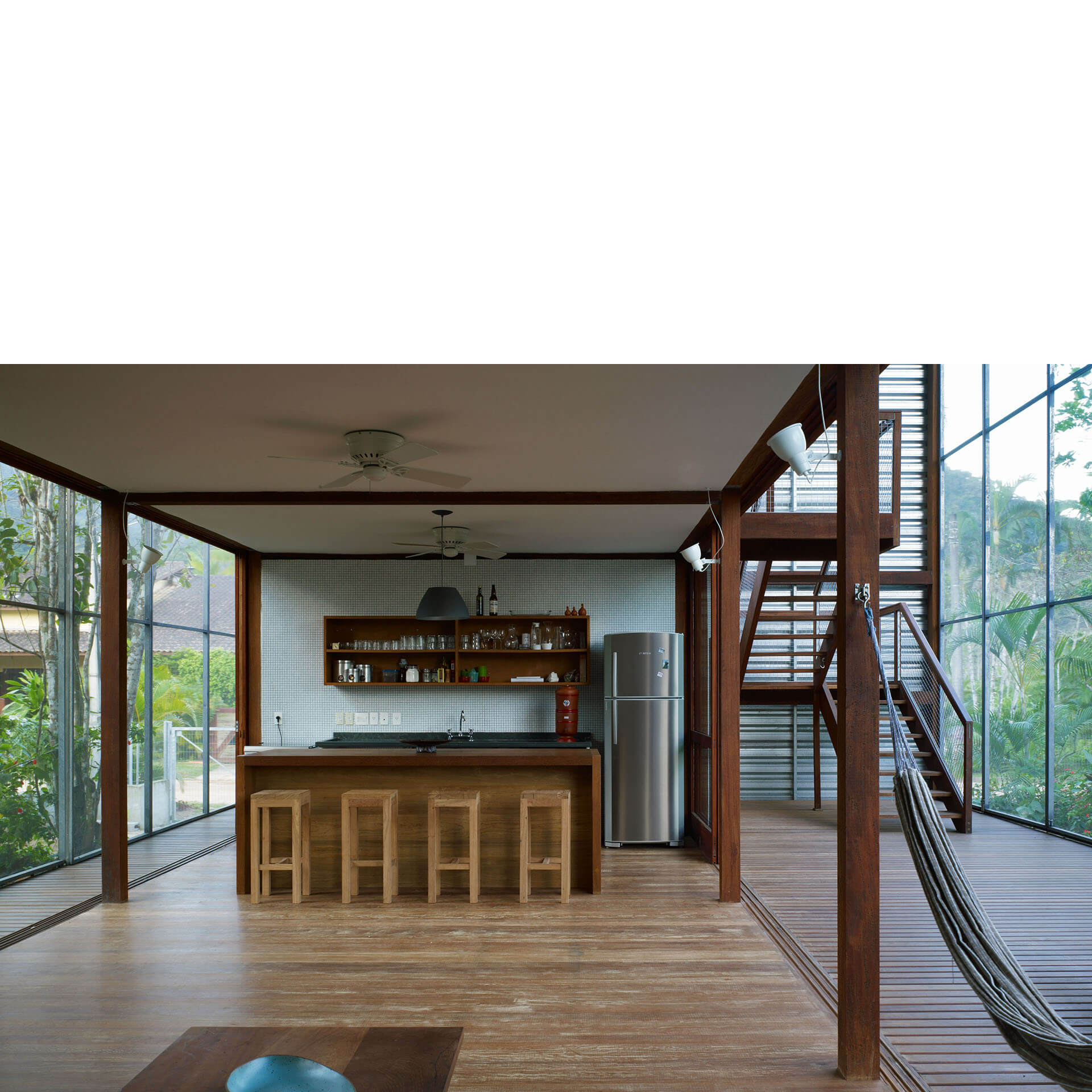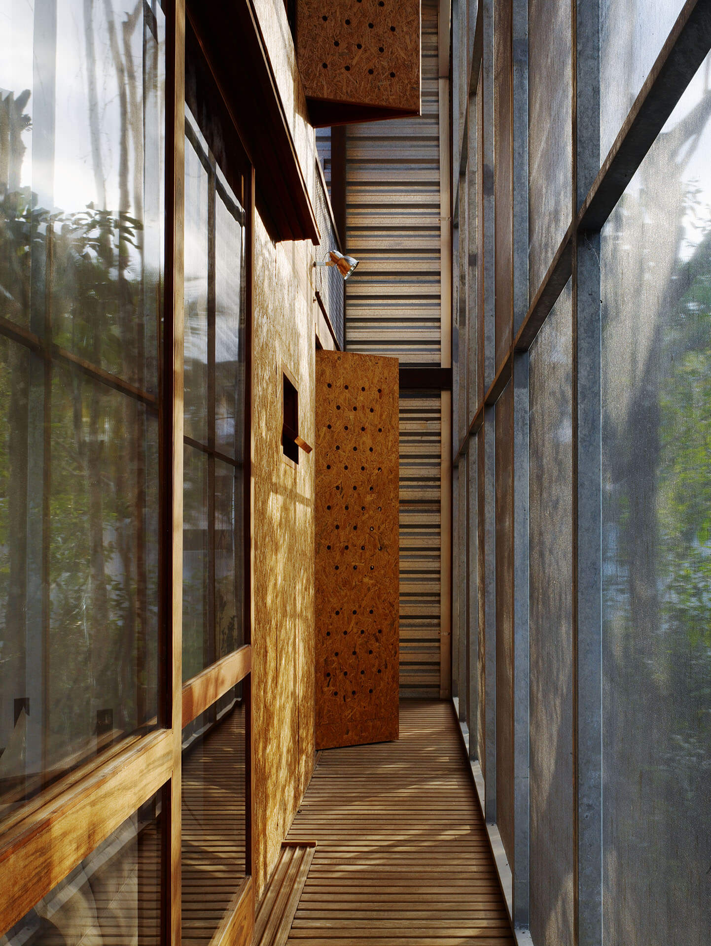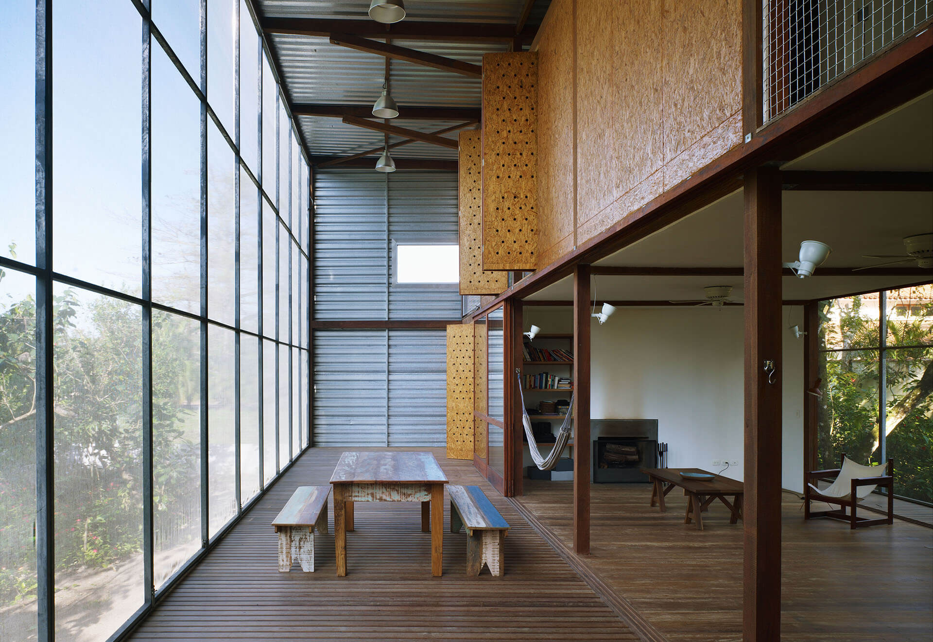 Nas duas fachadas maiores da casa, francamente abertas para a paisagem, foram instalados painéis de telas de fibra de vidro e PVC, montadas em requadros de aço, pivotantes ou deslizantes, com o intuito de criar uma membrana externa, capaz de manter os insetos fora, sem criar obstáculo para a visual ou para a brisa do mar.