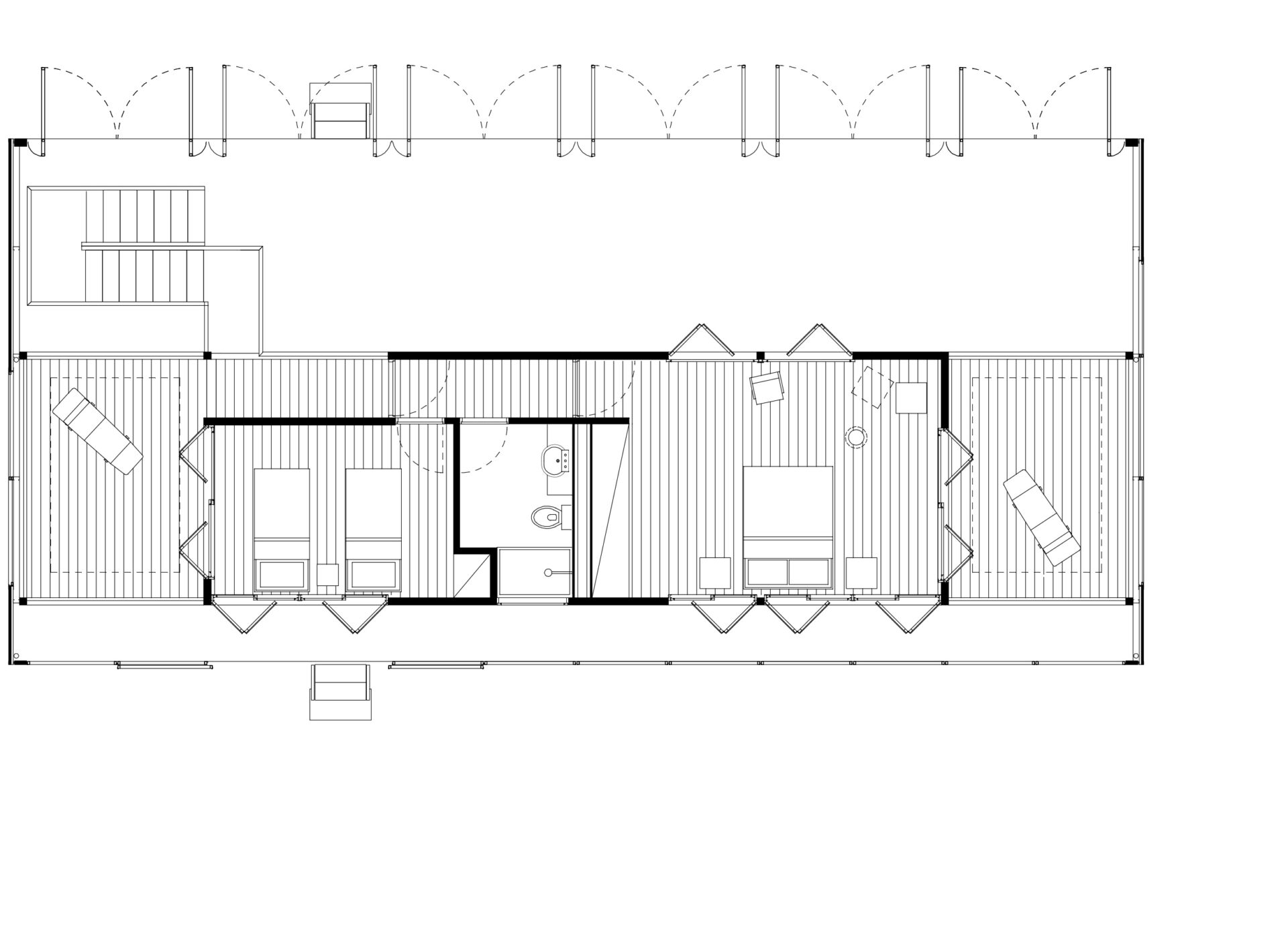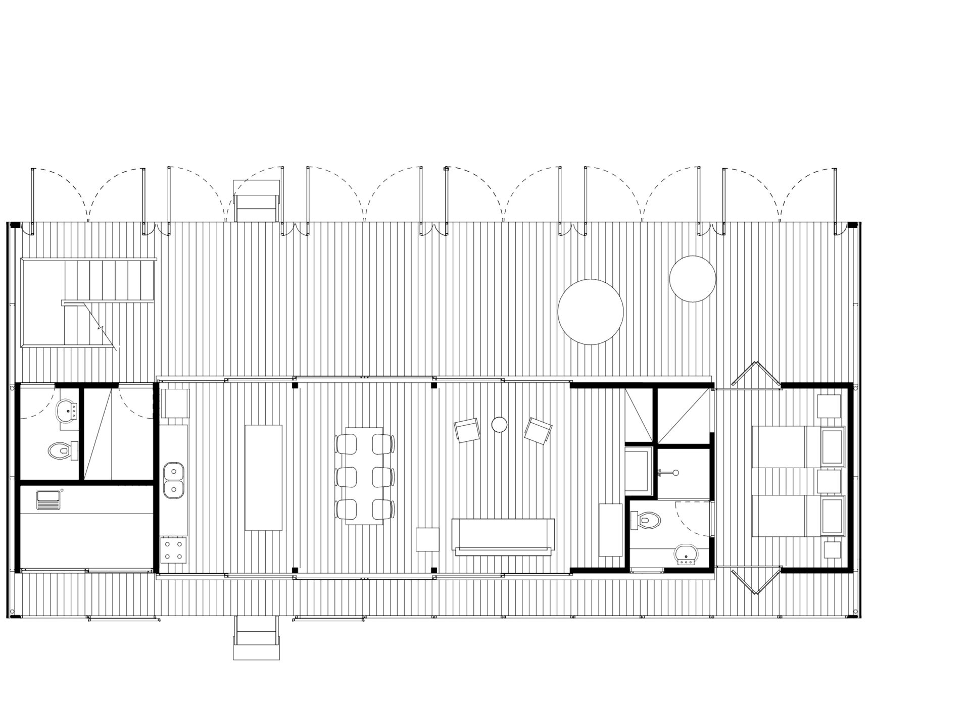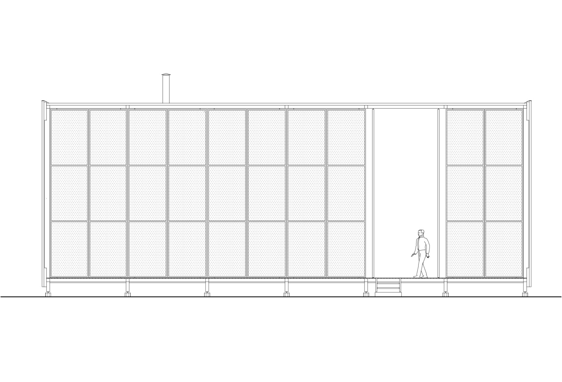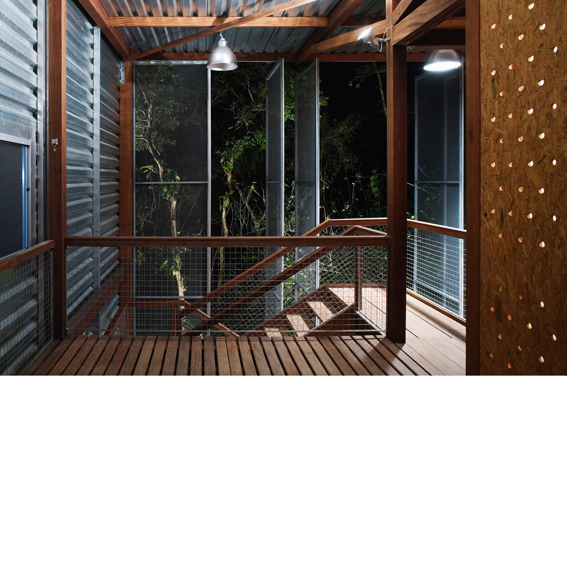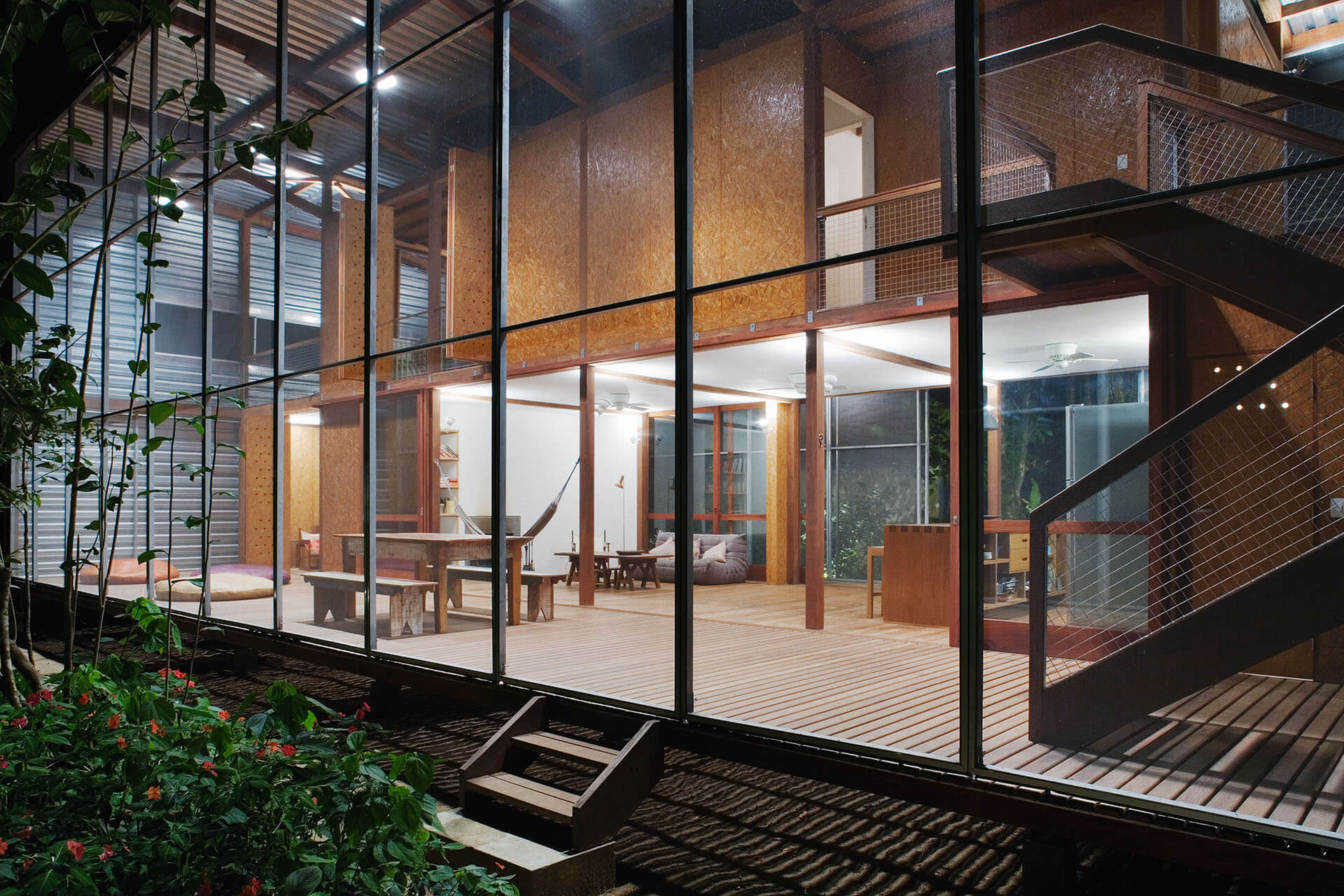 Nas duas fachadas maiores da casa, francamente abertas para a paisagem, foram instalados painéis de telas de fibra de vidro e PVC, montadas em requadros de aço, pivotantes ou deslizantes, com o intuito de criar uma membrana externa, capaz de manter os insetos fora, sem criar obstáculo para a visual ou para a brisa do mar.