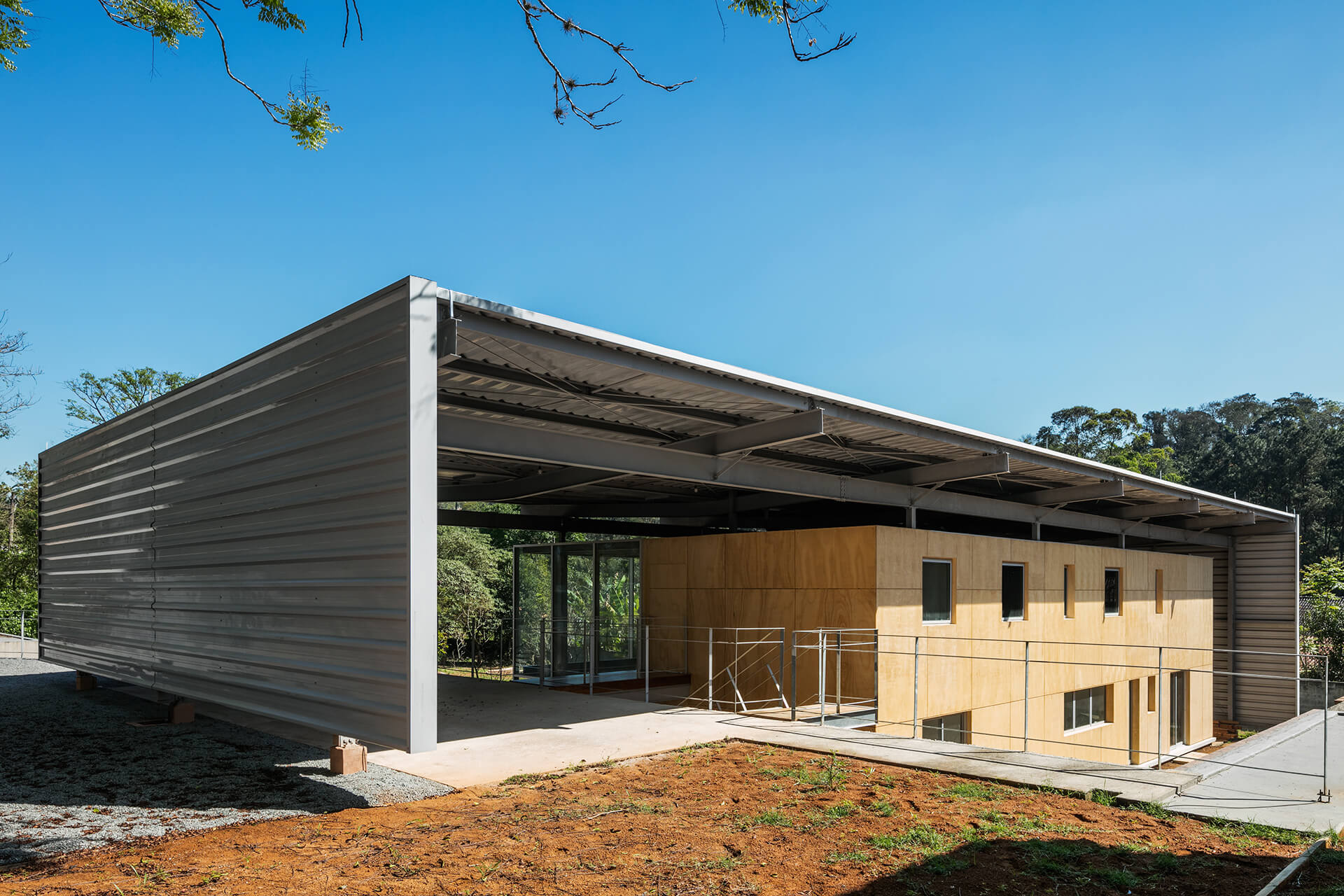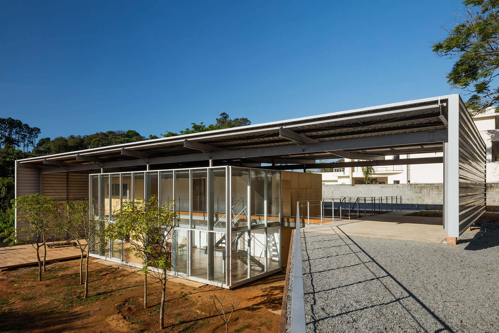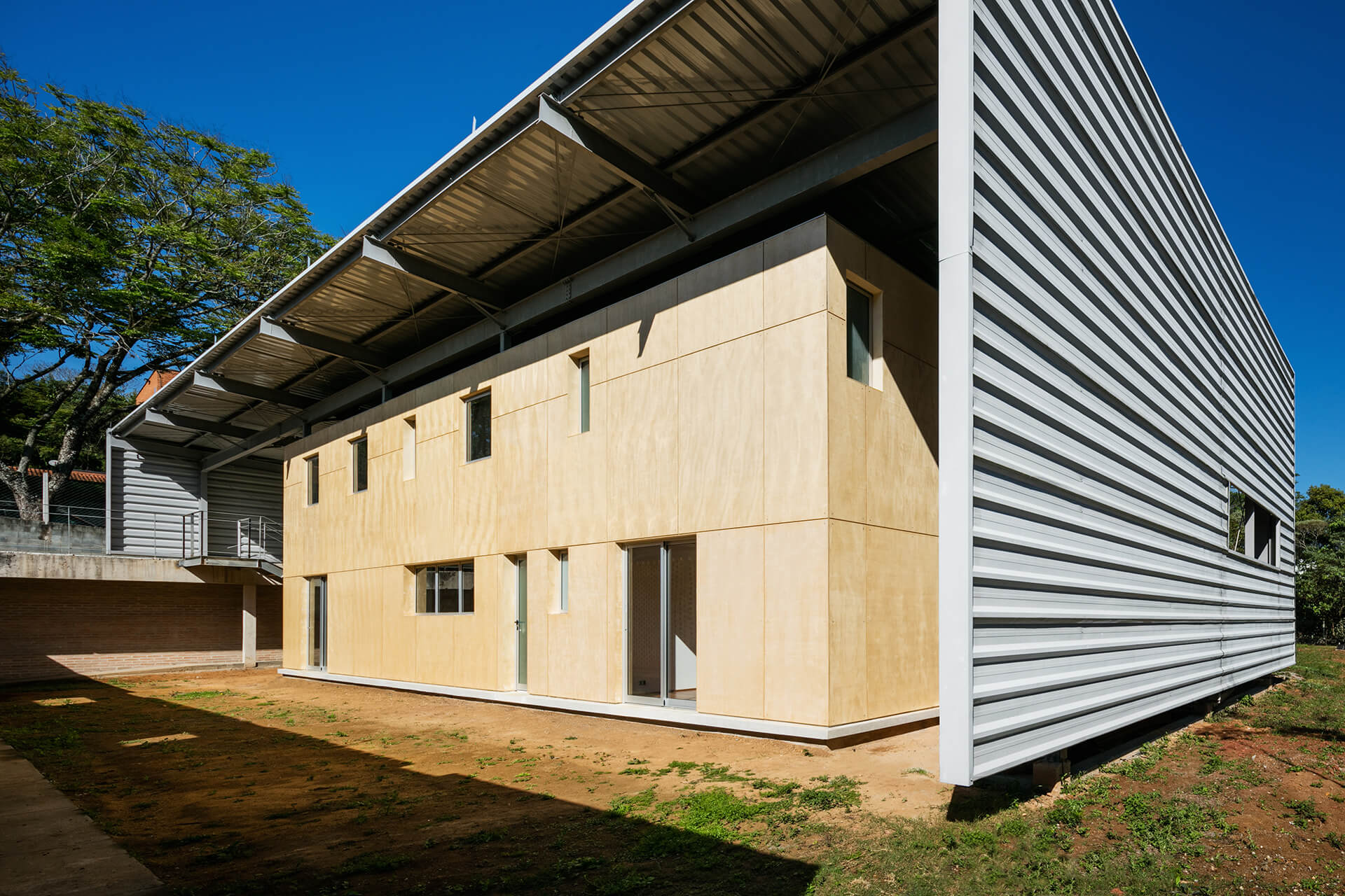 O volume interno está inserido dentro de uma cobertura com sete metros de altura e dezessete por dez metros de base, uma telha metálica termoacústica construída com estrutura metálica.