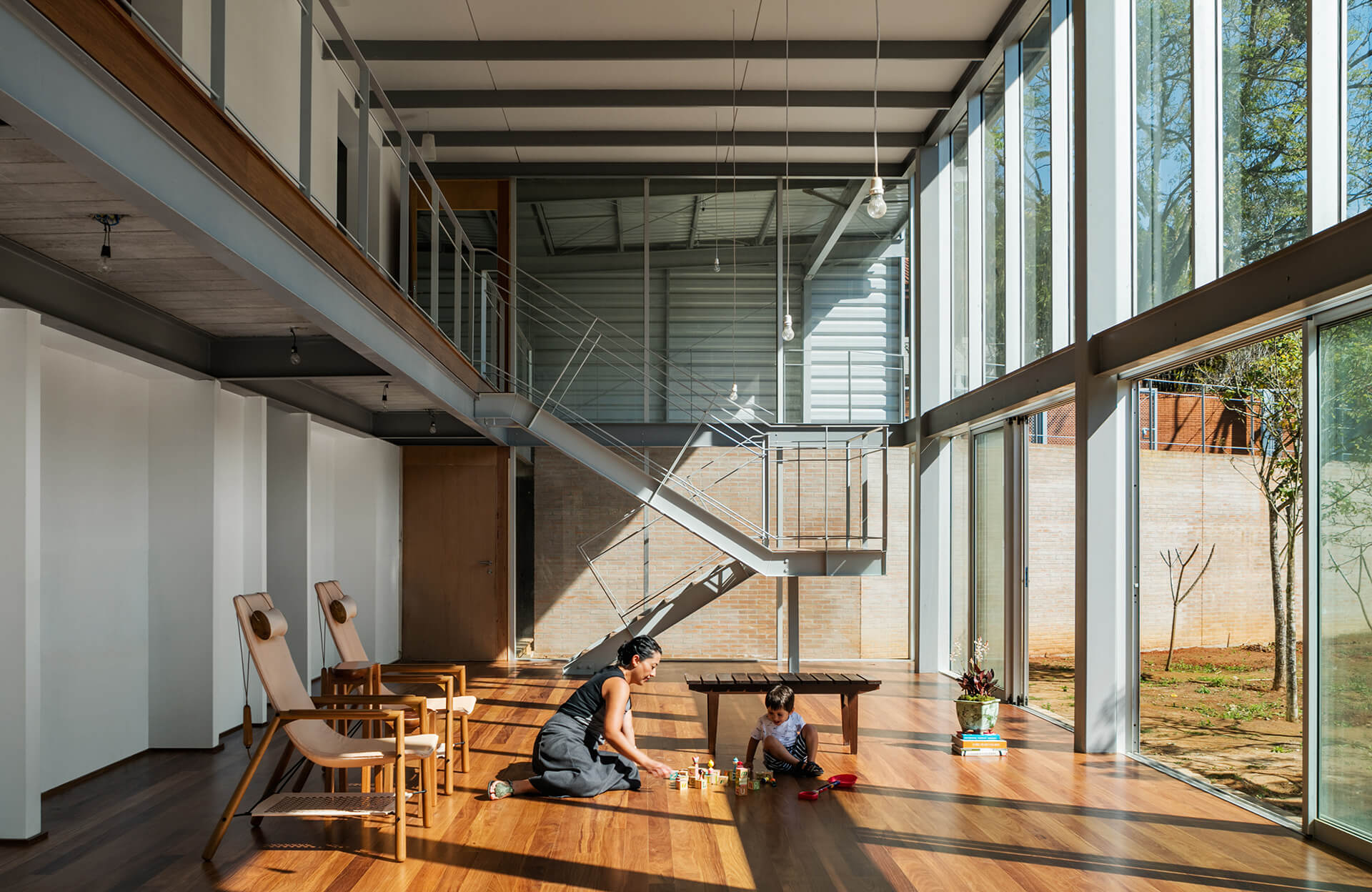 A solução foi criar um sistema de fechamento constituído por duas camadas sobrepostas. A primeira pele — a exterior — é feita com policarbonato com janelas camarão, que possibilita a iluminação da casa e ajuda na regulação térmica dos espaços internos; a segunda pele é constituída por um sistema de fechamento em vidro com janelas de correr, cujos suportes e perfis de fixação são leves.
