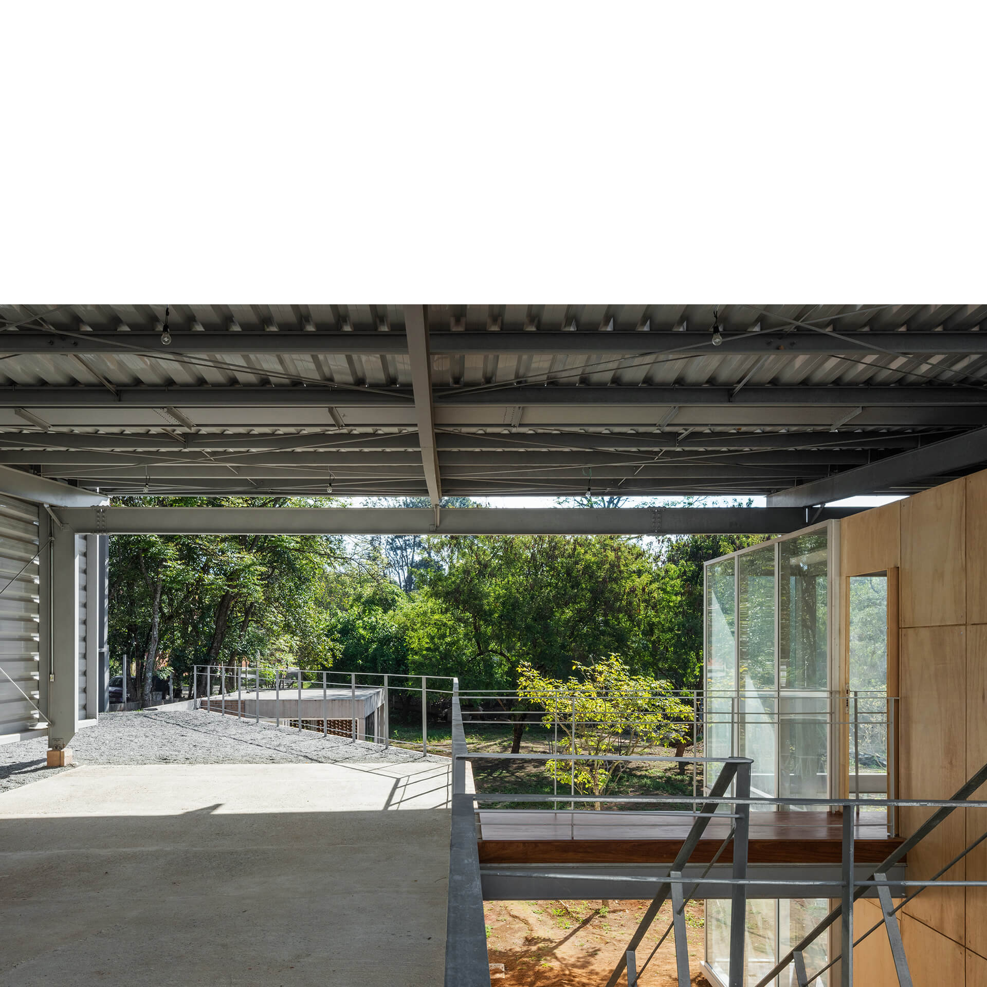 Imaginamos essa casa — um volume de 13 x 29 x 5,55 metros, suspenso 35 cm do solo — aberto para a mata na qual está inserido. O volume é construído com estrutura metálica. Os fechamentos internos são feitos de drywall.